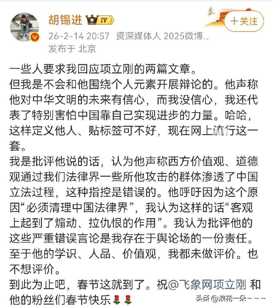就在刚刚! 胡锡进回应了项立刚的两篇文章! 看了老胡的回应,并没有说多少话,但是,我认为该点到的都点到了,按照他的结论此事就到此为止了,如果还争辩下去的话,那可没完没了,也没有多大必要和意思了! 再说了,以我看来,老胡就不用说了一辈子媒体人,也退休了,现在靠流量吃吃饭过过好日子也是正常的,本来就是自己专业的余热发挥。 老项呢,其实,本来就是号称“燕京大写手”,好像是有自己的空气净化器公司,也是5G通信专家,但是,现在也离不开网络,哪里有热点,基本上都有老项,似乎现在跟老胡的职业差不多。 所以说,两个人因为一件事正好碰到了一起擦到了火花,玩流量的机会就来了,网上都一时刹不住车了,热闹的勒,其实,最后热闹劲过去了,本质上他们所认为的问题一点也没得到解决,就是乐呵了一下呗。[捂脸] 最后,既然老胡都说到此为止了,老项看了老胡的回应后也就别再回应了,再回应我看意义就不大了,这一波流量吃完就够了,再接着找下一个人接下一个话题吧,毕竟,世界之大,无奇不有。[比心]