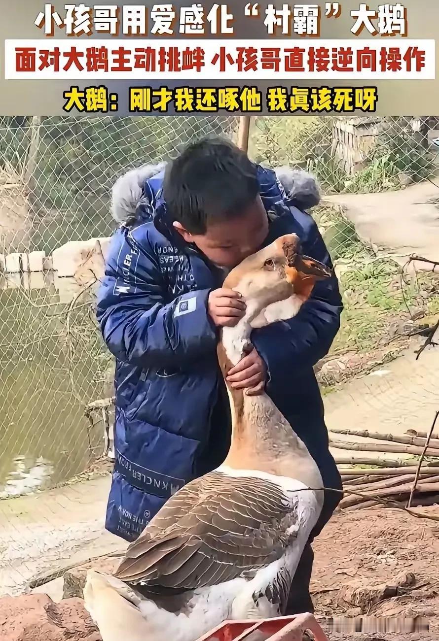 “笑不活了!”重庆,一男孩回老家过年,看到大鹅就忍不住上去逗一下,不料,大鹅并不友好,甚至还啄了男孩两口,没想到,男孩并不生气,反而逆向操作用爱把大鹅给感化了! 那是大年初三的下午,院子里的泥地还带着点潮气。大鹅正低着头在泥里找食,男孩凑过去的时候,脚步放得很轻,可还是惊动了它。 大鹅猛地抬起头,脖子绷得紧紧的,眼睛里带着警惕,翅膀微微张开,摆出了攻击的架势。男孩没退。反而往前又挪了一步。伸手想去摸它的头。 就是这一下,大鹅的喙狠狠啄在了他的手背上。手背上传来一阵钝痛,带着点凉,还有点痒。他皱了皱眉,却没喊出声,也没收回手。 旁边看热闹的大人都捏了把汗。这鹅是村里出了名的“村霸”,平时连路过的狗都敢追着啄,更别说主动凑上去的人了。 有人喊了一句“快躲开!”,男孩却像没听见一样,只是盯着大鹅的眼睛,声音放得很柔:“我不打你,我就是想摸摸你。” 他的手慢慢抬起来,这次没有直接去碰,而是停在离大鹅脖子几厘米的地方,等着它主动靠近。大鹅一开始还保持着警惕,喙微微张着,像是随时准备再啄下去。 可过了几秒,它发现男孩没有任何攻击性的动作,眼神里也没有恶意,反而带着点小心翼翼的温柔。它的脖子慢慢放松下来,翅膀也收了回去,试探着往前挪了一小步,用头轻轻碰了碰男孩的手。 男孩抓住这个机会,轻轻把手放在了大鹅的脖子上,顺着它的羽毛慢慢抚摸。大鹅的羽毛很软,带着点阳光的温度,它没有再反抗,反而把脖子往男孩的手里蹭了蹭,像是在撒娇。 旁边的大人都看呆了。谁也没想到,平时凶神恶煞的大鹅,竟然会在一个小孩的手里变得这么温顺。 从那天之后,大鹅就像变了一只鹅。只要男孩一出现,它就会主动凑过去,用头蹭他的腿,跟着他在院子里转来转去。 有时候男孩坐在门槛上玩手机,大鹅就会安静地趴在他脚边,头靠在他的膝盖上,像是在撒娇。村里的小孩一开始还不敢靠近,后来看到大鹅对男孩这么温顺,也慢慢敢凑过来摸它的头了。 有人问男孩,被大鹅啄了之后为什么不生气。他只是挠了挠头,说:“它啄我,肯定是因为怕我伤害它。 我要是打它,它就更怕我了,以后见了我就会更凶。我对它好,它就知道我没有恶意,自然就不会再啄我了。” 这话听起来简单,却藏着最朴素的道理。我们总是习惯用对抗来解决冲突。别人对我们凶,我们就比别人更凶。别人伤害我们,我们就想着报复。 可很少有人会停下来想一想,对方的敌意背后,是不是藏着恐惧和不安。如果我们能像这个男孩一样,先放下自己的攻击性,用温柔去回应对方的敌意,或许很多矛盾都能迎刃而解。 大鹅的变化也印证了这一点。它之前的凶,不是天生的,而是出于对陌生人和未知事物的恐惧。当男孩用爱和耐心消解了它的恐惧之后,它自然就放下了防备,变得温顺起来。 这就像我们身边的很多人,他们看起来冷漠、刻薄,甚至充满攻击性,可背后可能藏着一颗脆弱的心,需要被理解和温柔对待。 过年的假期很快就过去了,男孩要回城里上学了。临走的那天早上,他特意起得很早,去院子里找大鹅。 大鹅好像知道他要走,一看到他就凑了过来,用头蹭他的手,叫个不停。男孩蹲下来,又抱了抱它,亲了亲它的头,说:“我要走了,下次回来再陪你玩。” 大鹅好像听懂了,不再叫了,只是用头蹭了蹭他的衣服,然后慢慢转身走回了院子的角落,低着头,像是在难过。车开的时候,男孩从车窗里回头看,大鹅还站在院子的门口,脖子伸得长长的,望着车离开的方向。 他的眼睛有点红,却没哭,只是攥紧了手里的书包带,心里想着,下次回来,一定要再抱抱这只被他用爱感化的“村霸”大鹅。 这个故事看起来只是一个小孩和一只大鹅的互动,却藏着最深刻的人性启示。在这个充满戾气的时代,我们太容易被情绪左右,太容易用对抗和攻击来保护自己,却忘了,温柔和理解才是最有力的武器。它不是软弱,而是一种力量,一种能化解仇恨、建立信任的力量。 各位读者你们怎么看?欢迎在评论区讨论。