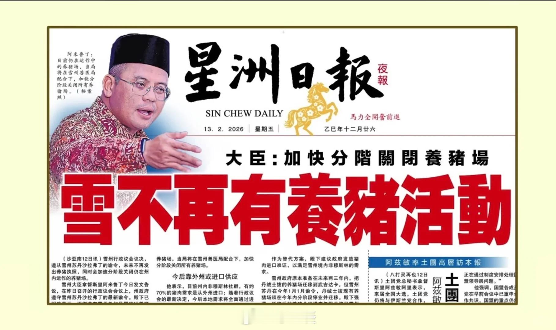 马来西亚雪兰莪州全面停止州内的养猪业。雪州大臣拿督阿米鲁丁称:“通过这项决议,任何与猪相关的争议都应立即停止,任何一方不得再延续此议题,以免意图破坏族群和谐。”