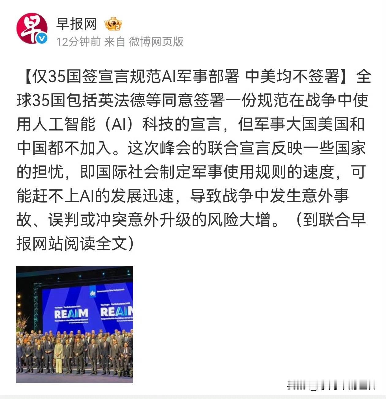 仅有35国签署宣言规范AI军事部署,中美均未签署。 在西班牙举办的AI军事峰会上,英法德等35国达成一致,同意签署一份规范在战争中运用人工智能(AI)科技的宣言,然而军事大国美国和中国并未加入。 这着实可笑。 这就如同太监要求别人不要生孩子一般荒谬! 顺带一提,俄罗斯同样没有签署。 联合国五常中,上三常都未签署! 中美未加入,是因为这两国切实掌握着AI技术。 俄罗斯未加入,是担忧一旦加入,未来在AI领域的发展会受到限制,无法从邻国进口自身急需的AI技术产品。 美国未加入,是害怕加入后会拉大与大国的技术代差。 至于那些签署的国家。 是因为他们确实没有AI技术,所以妄图凭借一纸合约来限制拥有AI的国家。 说白了,他们的目标就是中美两国。 2025年,我国向联合国提交《中国方案》,强调“人控最终决策权”,主张优先在边境巡逻、救灾等低风险场景对AI系统进行测试。中美AI新格局 中美ai实力 中美ai博弈