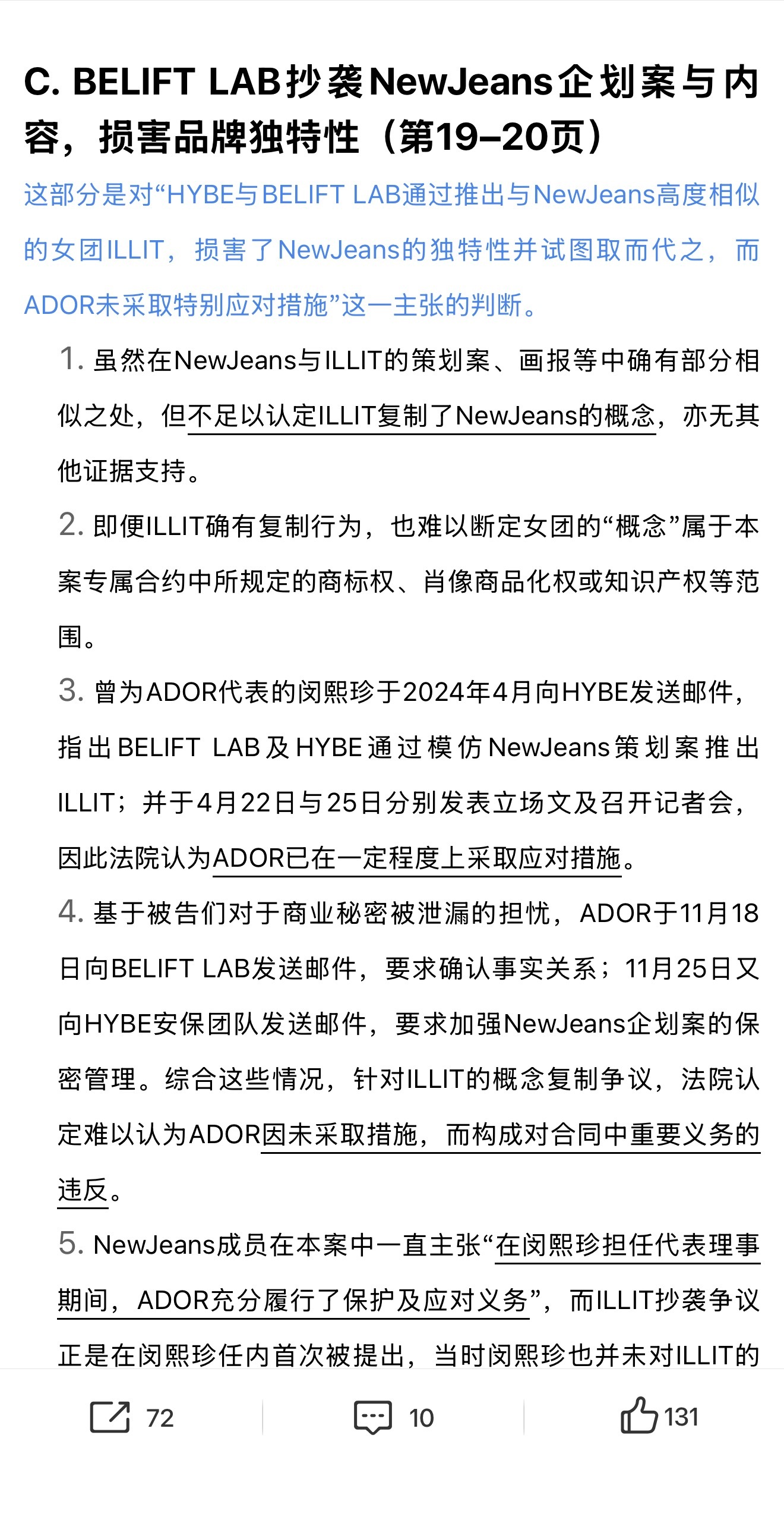 有关newjeans一审败诉的判决书中有关illit抄袭的部分1。虽然在NewJeans与ILLIT的策划案,画报等中确有部分相似之处,但不足以认定ILLIT复制了NewJeans的概念,亦无其他证据支持。2。即便ILLIT确有复制行为,也难以断定女团的"概念"属于本案专属合约中所规定的商标权,肖像商品化权或知识产权等范围。