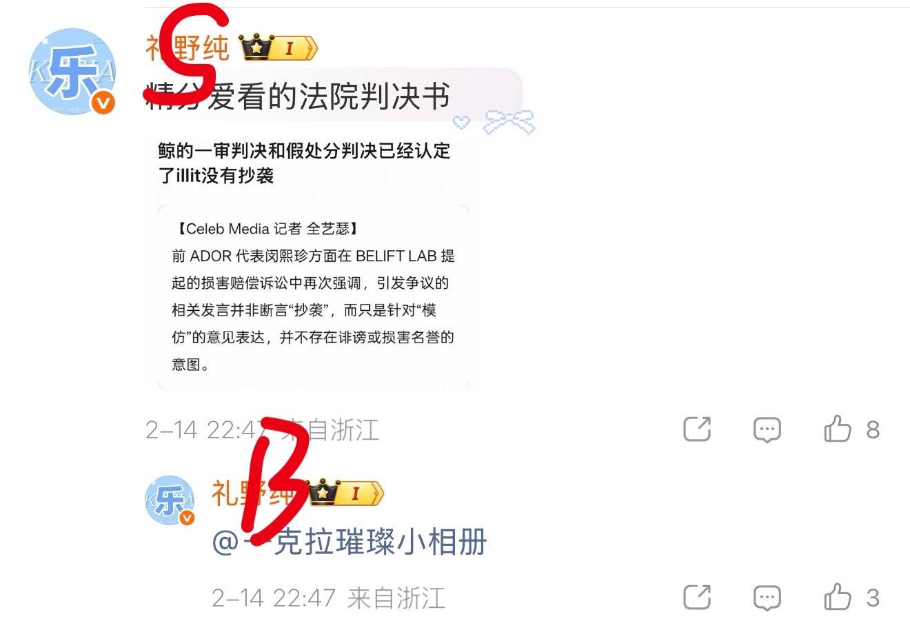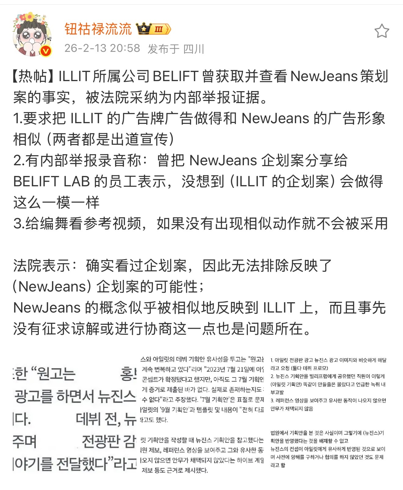 不知道怎么到了图2沥粉嘴里就变成了一审认定illit没有抄袭了 况且沥沥能不能仔细看看自己带了一张新闻稿想干啥illit newjeansnewjeans