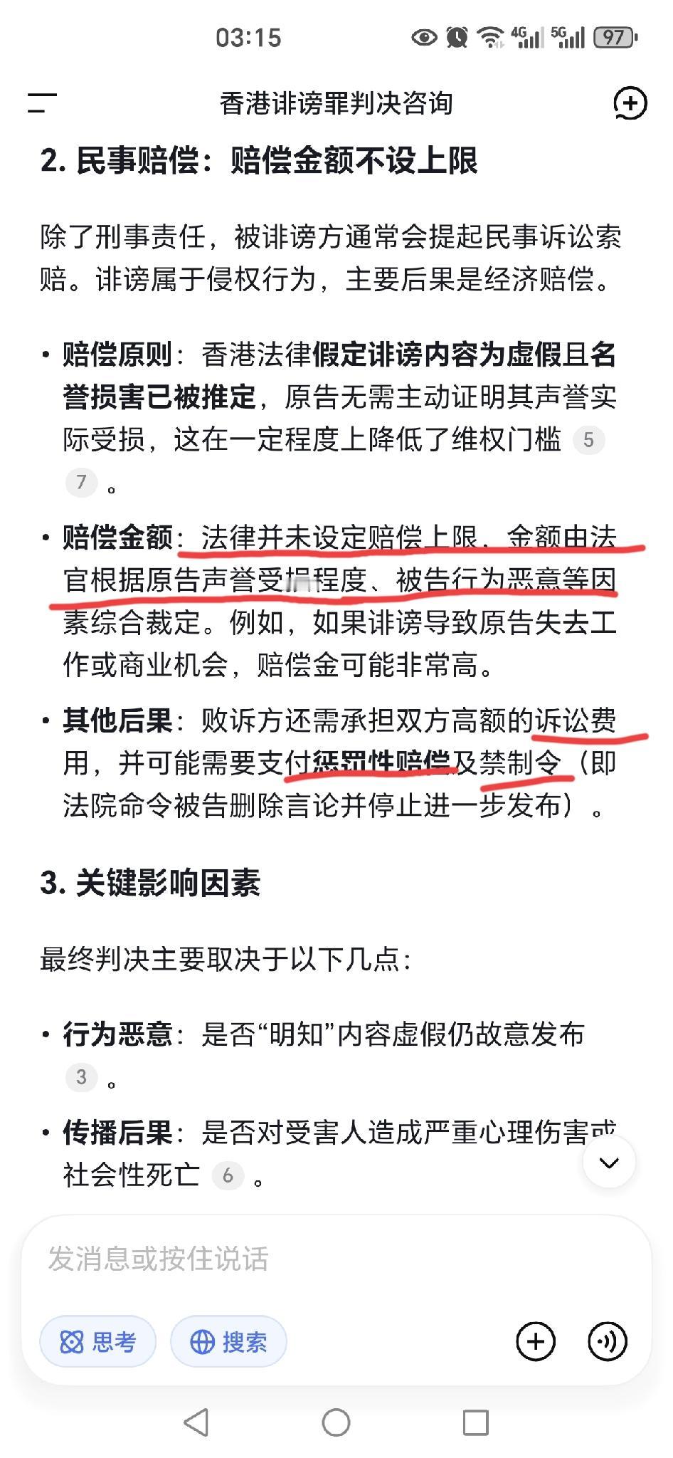 发现很多网友仍然认为徐子淇老公告周秀娜是作秀🤷♂️,但是,请大家注意,李家诚告她告的是诽谤。 在港岛的律条里,诽谤既属于民事侵权(可索赔,金额无上限),也可能构成刑事犯罪(可判刑坐牢)。 而且,李家诚不但告了周秀娜,还告了发布视频的平台——5个油管频道和谷歌。 所以,李家诚告周秀娜是认真的,而且,他的律师团队必然很强劲,而且,他提交了网络证据。 所以,周秀娜这次……很可能要赔钱➕吃上公家饭了。不知道岛上要不要踩缝纫机[黑线]