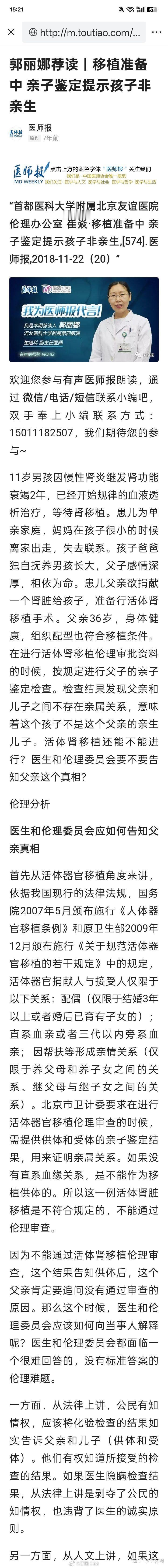 一男子捐肾给儿子却发现儿子非亲生2018年《医师报》刊文,表扬了首都医科大学附属北京友谊医院伦理办公室隐瞒亲子鉴定。事情的起因是一个儿子 需要肾移植。其父决定捐肾给儿子。在做手术之前,需要验证肾的匹配度。结果发现其母出轨,儿子并非父亲亲生。首都医科大学附属北京友谊医院伦理办公室以告知真相会导致家庭破裂为由,决定隐瞒真相。之后,《医师报》发文赞颂了隐瞒真相的行径。