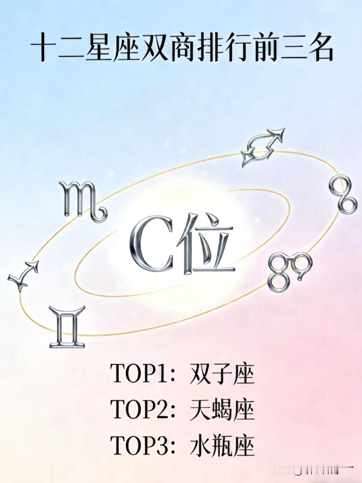 12星座“双商天花板”排行大揭秘:看看你排第几![送心] 想知道十二星座谁是双商界的天花板吗?这份榜单为你揭晓了答案:从第12名到第1名依次排行! ♋巨蟹座:温柔感性,是情感细腻的典范。 ♉金牛座:务实稳重,做事靠谱没得说。 ♈白羊座:率真且坦荡,活的那叫一个通透。 ♌狮子座:自信又大气,自带主角的光环。 ♓双鱼座:共情很细腻,是最懂你情绪的伙伴。 ♍处女座:细致又周全,细节把控发挥到极致。 ♐射手座:通透又洒脱,自由不羁且聪慧。 ♑摩羯座:沉稳又睿智,成熟稳重有谋略。 ♏天蝎座:洞察人心,心思敏锐似侦探。 ♒水瓶座:通透又豁达,清醒独立有格调。 ♎天秤座:左右能逢源,社交达人非其莫属。 而双子座以八面玲珑的特质,荣登双商排行第1名。 个人观点仅供娱乐参考。 鸿运马上来 发优质内容享分成