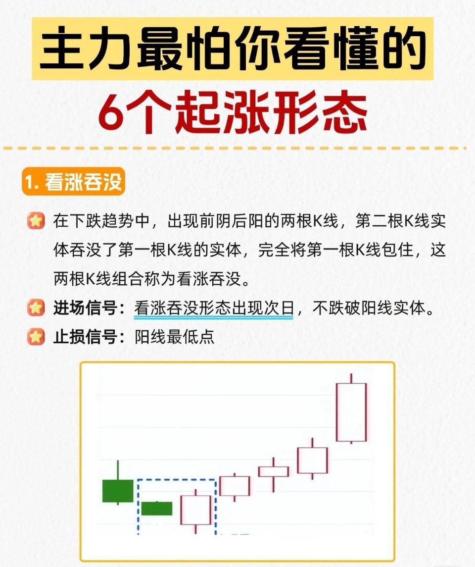 1.看涨吞没:前阴后阳两根K线,阳线实体吞没阴线实体→次日不跌破阳线实体进场,止损阳线最低点。