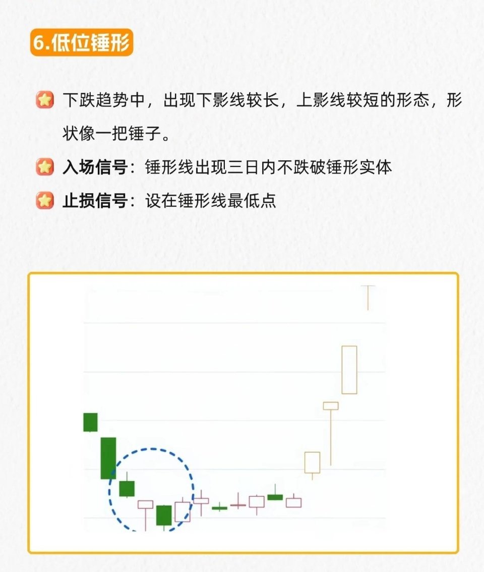 6.低位锤形:下跌中下影长(≥实体2倍)、上影短/无的锤子线→三日内不跌破实体进场,止损锤形最低点。