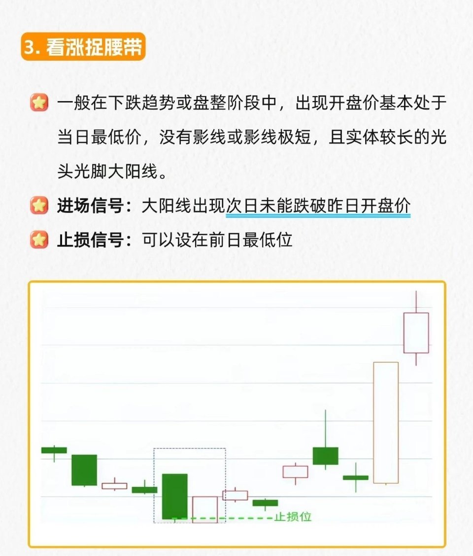 3.看涨捉腰带:下跌/盘整中,开盘近最低、无/短影线、长实体的光头光脚大阳线→次日不跌破昨日开盘价进场,止损前日最低位。