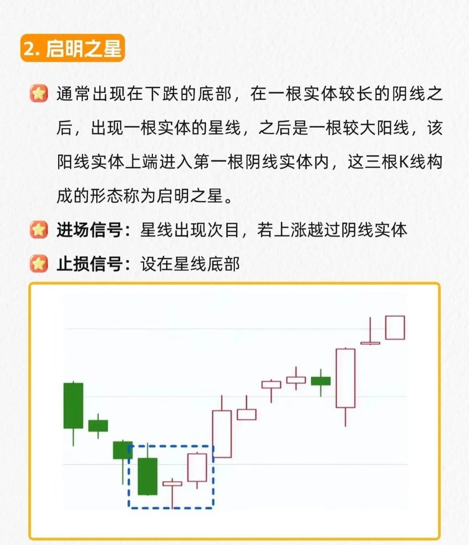 2.启明之星:下跌底部,长阴线+星线+大阳线(阳线上端入阴线实体)→星线次日上涨越阴线实体进场,止损星线最低点。