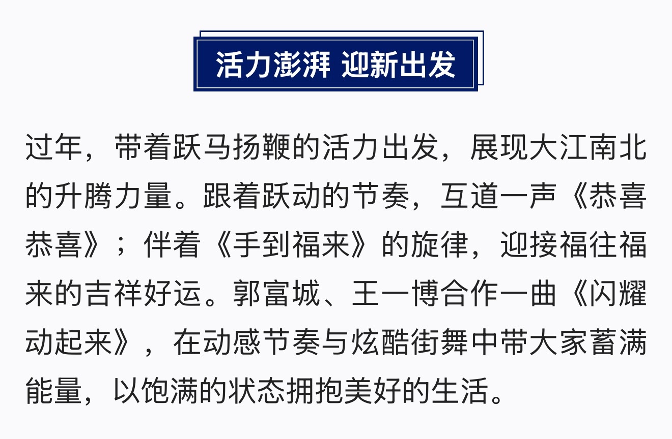 李健 《人间共鸣》任素汐 毛不易 《别来无恙》王菲《你我经历的一刻》郭富城、王一博 《闪耀动起来》陈小春、言承旭、罗嘉豪、易烊千玺 《智造未来》