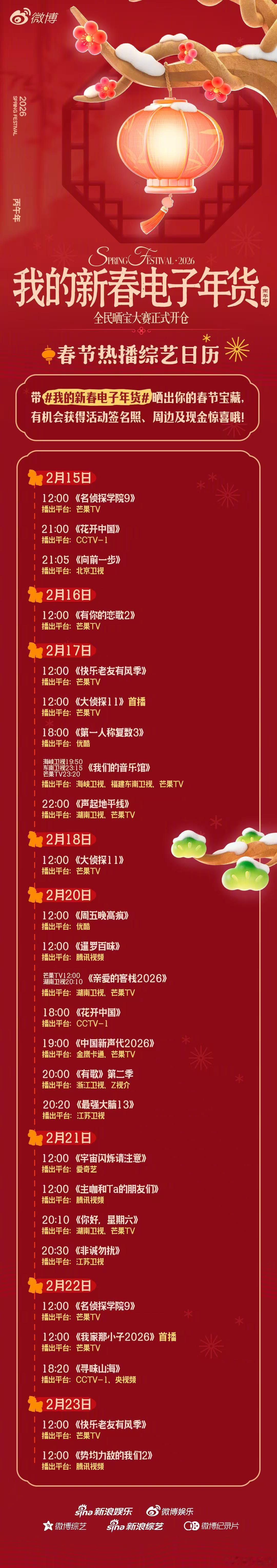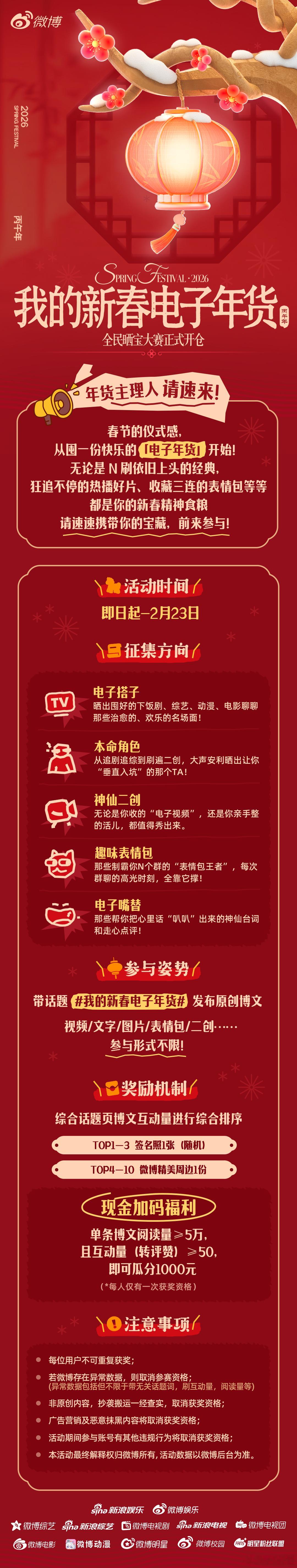 不止于看,更在于玩!新春 “电子年货” 征集📢 无论是神级剪辑的剧综二创、笑到劈叉的趣味表情包,还是精准戳心的电子嘴替语录……用创意玩转年味,用分享传递快乐✨ 带 我的新春电子年货 发博安利,有机会赢签名照、周边、现金奖励哦!更有春节热播剧综日历助你精准追更,不落下任何精彩!