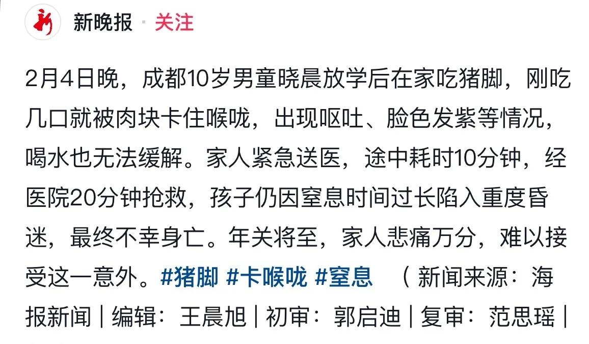 海姆立克急救法,家长们都要学会,关键时刻真的能救命,成都男孩晓晨家长如果会此急救,孩子也不至于窒息而亡。 一块美味腊猪蹄,要了孩子的命。 2月4日四川放寒假在家玩耍的10岁晓晨,被父母投喂了一块腊猪肉,却没想到就是因为这块腊猪肉卡住了晓晨的喉咙。 刚开始时,晓晨是呕吐,家长本是想着用水来压一压让他咽下去,这下可好,本来难以下咽的腊猪肉再加上水,挤压气管更加难以通气。 随着孩子的脸色越来越不好,家人没有给他使用海姆立克急救,只是打了急救电话等待救援。 10分钟后,晓晨被送到了医院,送进了抢救室。 只可惜,医生也是无力回天,短短10日后,晓晨永远的离开了他的家人。 真的是太可惜了,他的父母怎么想不通孩子就此这样离去,本该是爱的投喂成了要命的“毒药”,如果家长会海姆立克法 可能会有一线生机。 海姆立克法真的要广泛普及人人会用,这是救命的法宝。 过年了,避免不了聚餐吃吃喝喝,在吃饭的过程中要细咬慢咽,对于难以吞咽的食物不要尝试咽下去,也不要用其它食物企图压下去。 本来是过年一家人开开心心的聚在一起,可惜这个家庭将无比沉痛,这是教训也是警示,切记!切记!