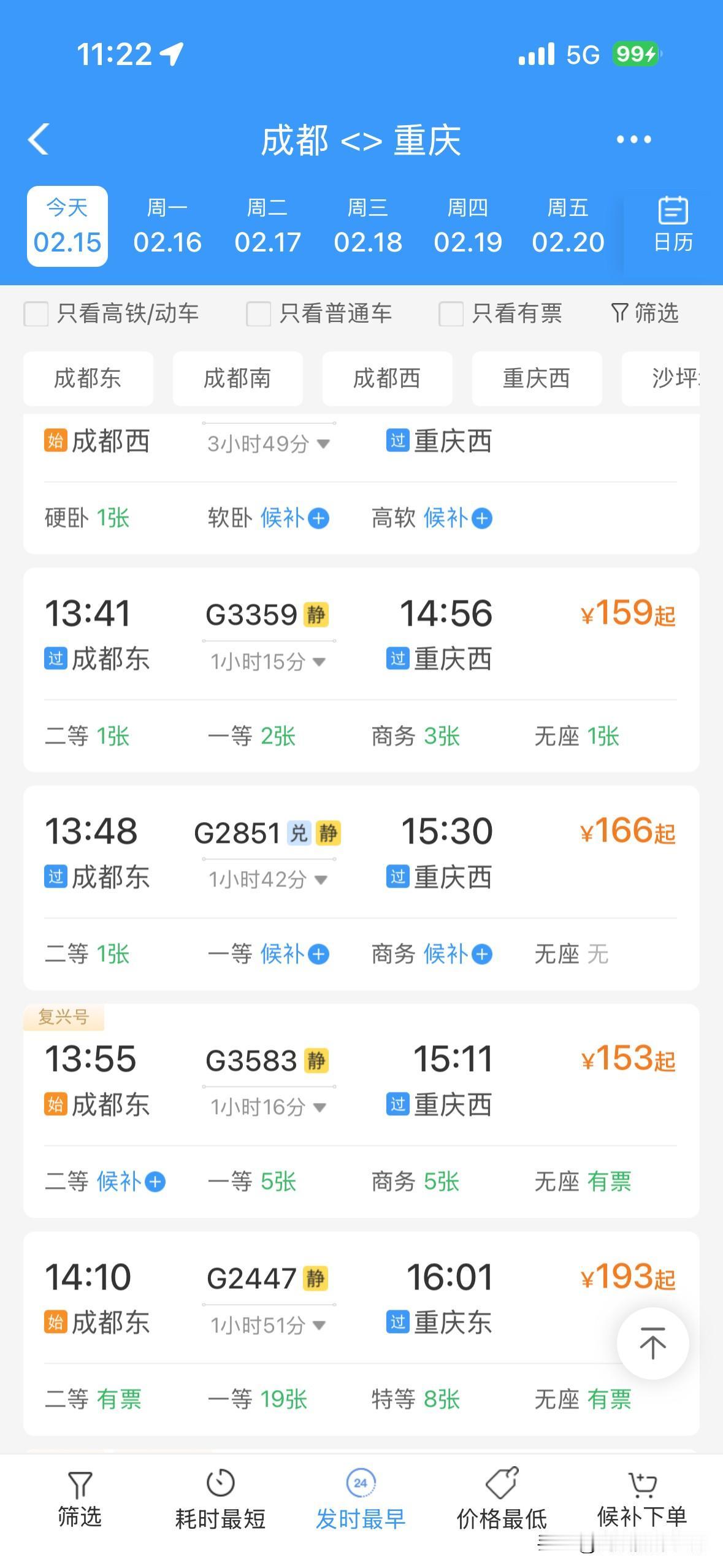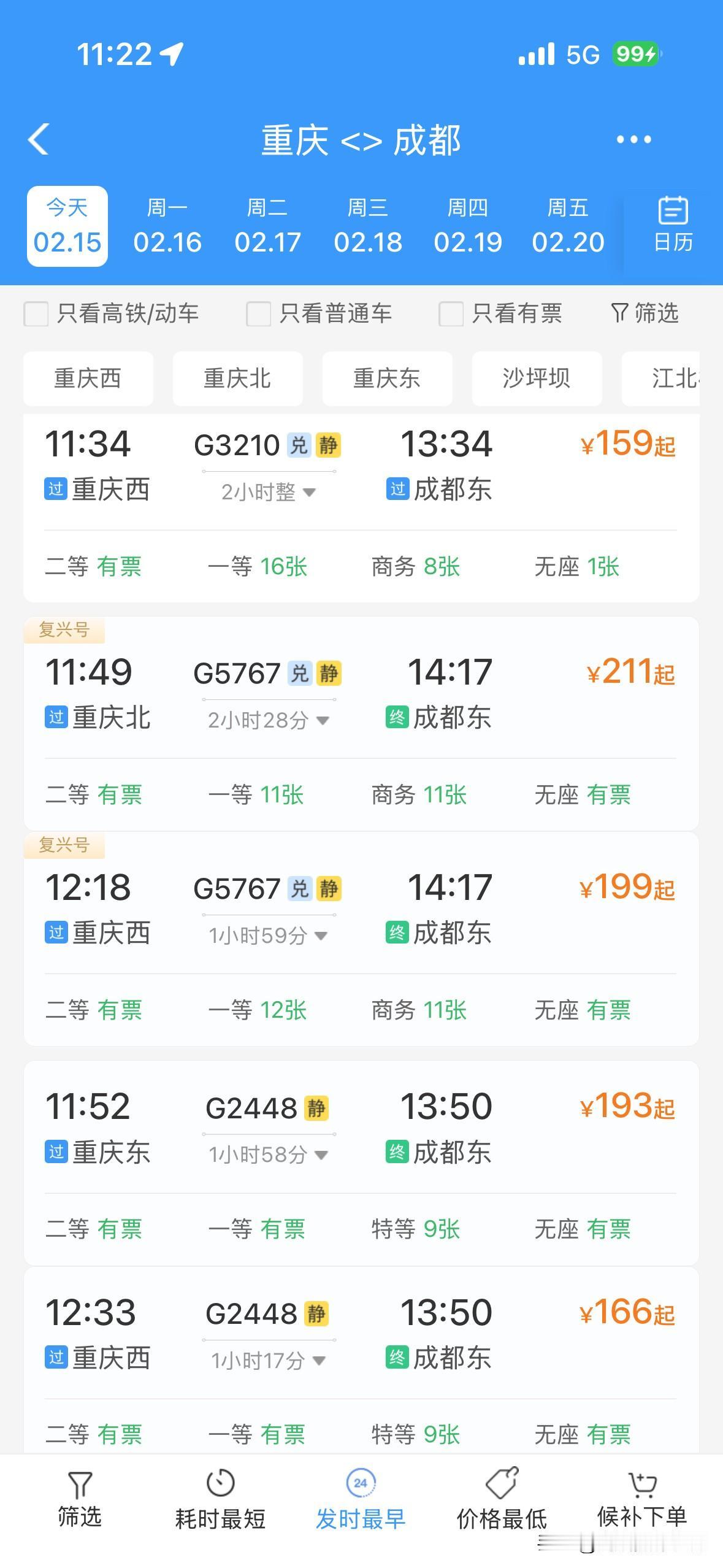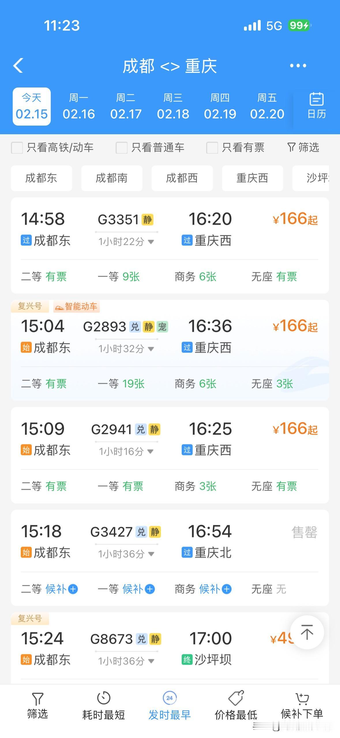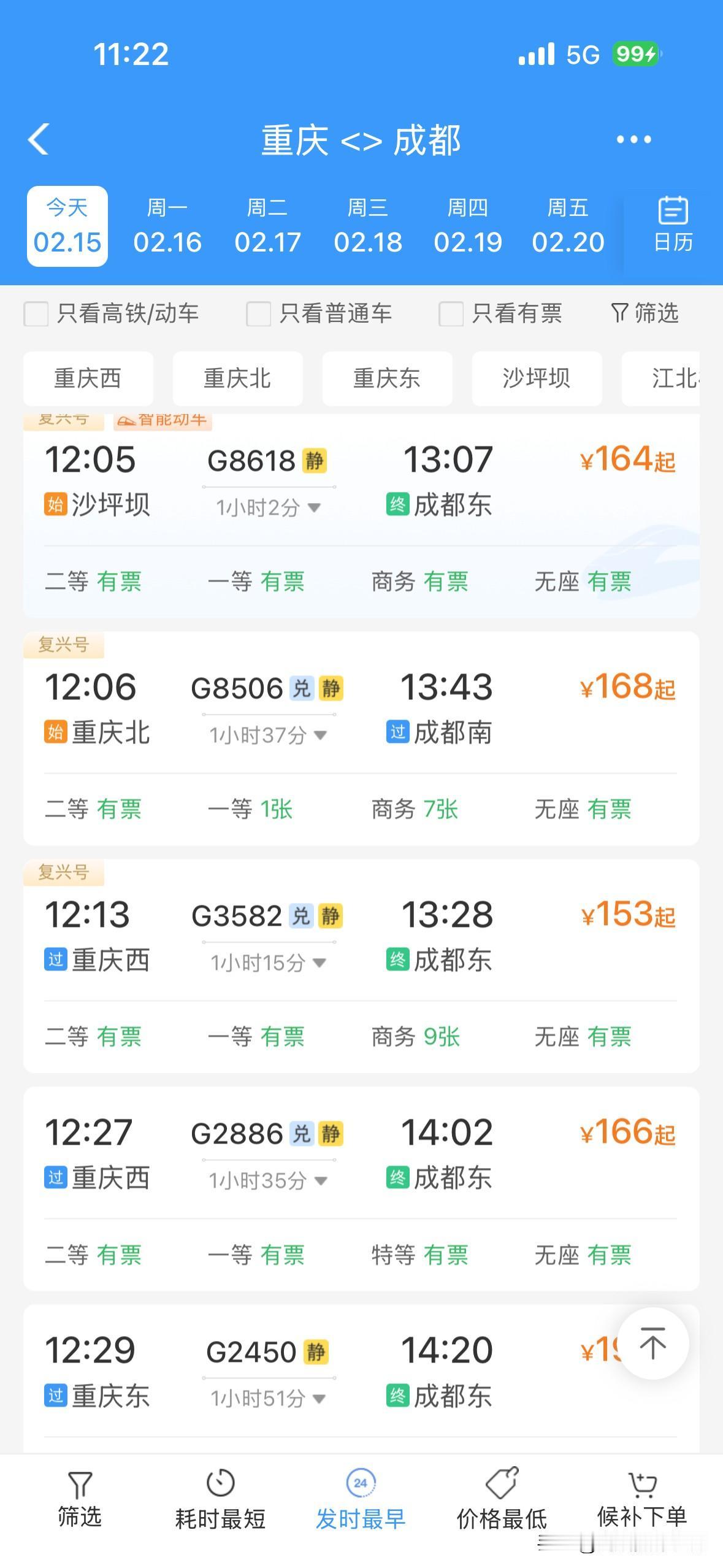 令人惊讶!2月15日上午,重庆的火车票居然还有很多呢!成都到重庆,重庆到成都,重庆到万州,贵阳到重庆……川渝两地,成渝经济圈,四川盆地……2026年春运,火车票好像普遍都没有以前那么的超级火爆和秒光…… 而且,2月14日下午和晚上,2月15日上午,离开成都的高速公路网络并没有出现史诗级超级大堵车……离开重庆主城区的高速公路网络也没有史诗级超级大堵车…… 今年春运,重庆,成都……无论火车票还是高速公路堵车,好像都明显不如之前的春节同期…… 也许,很多人,提前15天或者1个月就离开了重庆或者成都,回到了家乡…… 也许,很多人,不回老家过年,就留在重庆主城区或者成都市区过年…… 总体来说,感觉今年的春运气氛,不够火爆啊! 好吧,再过两年,等到重庆的米字形高铁网络建成,重庆到西安的高铁建成,成都到达州万州的高铁建成,沿江高铁建成……恐怕春运的气氛更加不够火爆吧?!