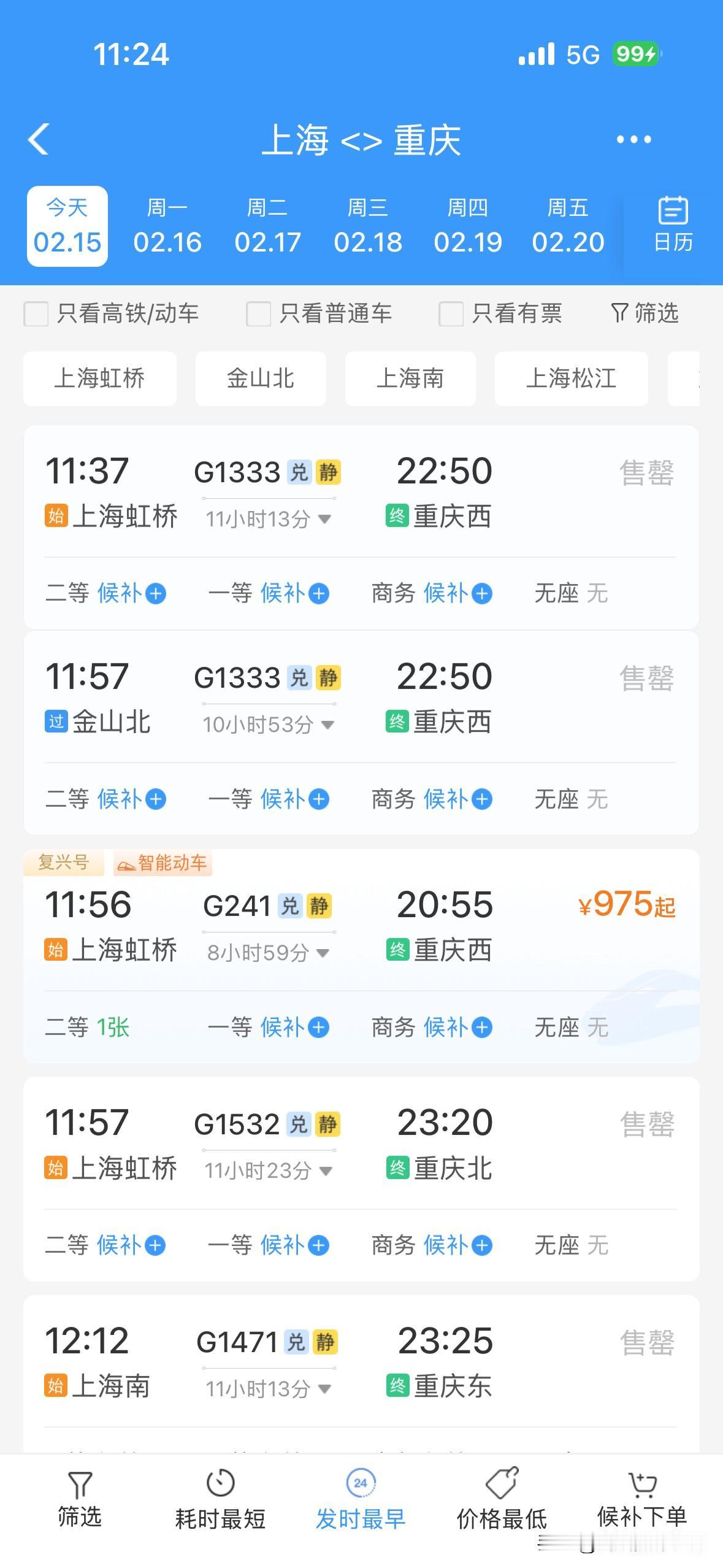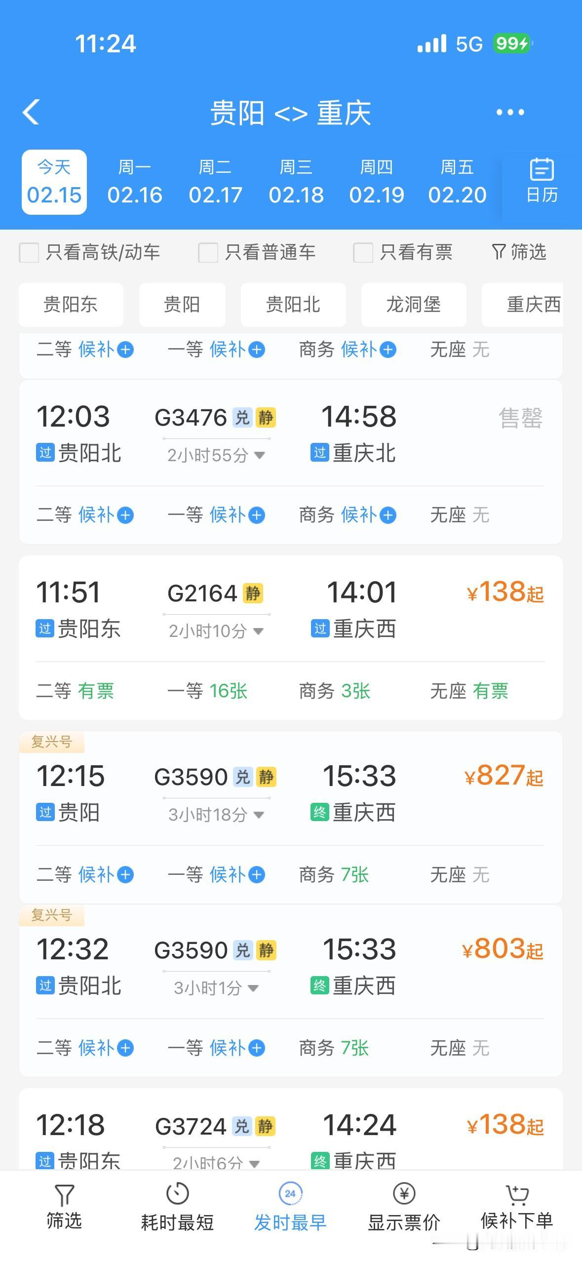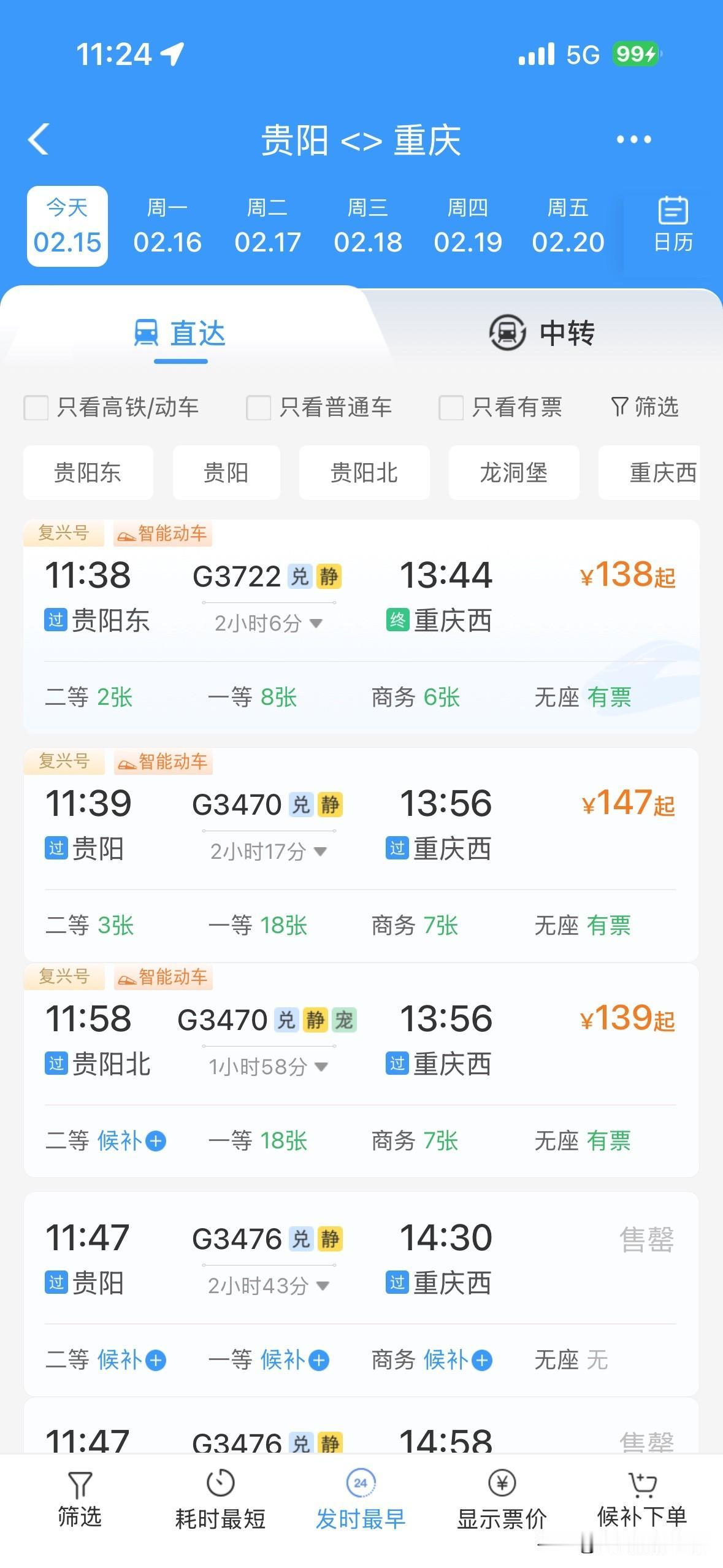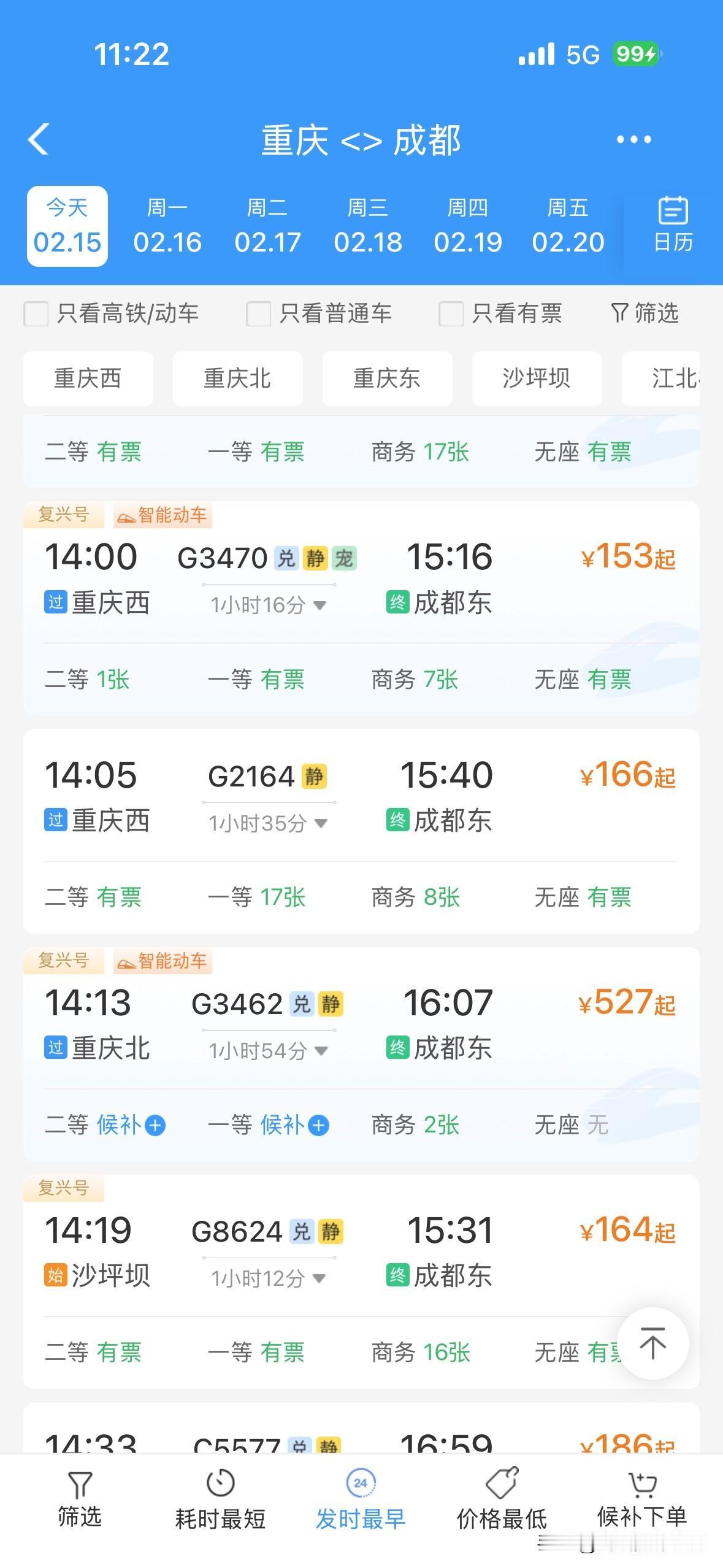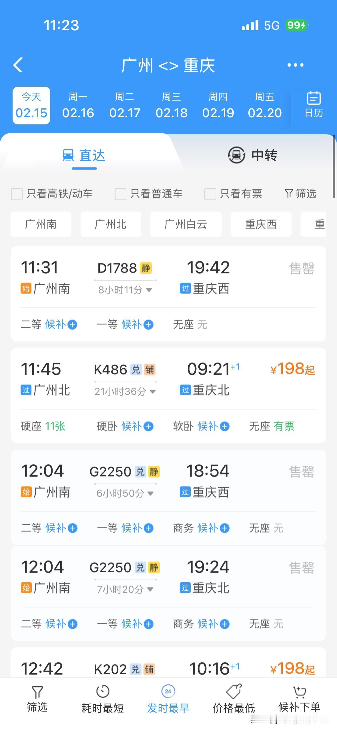令人惊讶!2月15日上午,重庆的火车票居然还有很多呢!成都到重庆,重庆到成都,重庆到万州,贵阳到重庆……川渝两地,成渝经济圈,四川盆地……2026年春运,火车票好像普遍都没有以前那么的超级火爆和秒光…… 而且,2月14日下午和晚上,2月15日上午,离开成都的高速公路网络并没有出现史诗级超级大堵车……离开重庆主城区的高速公路网络也没有史诗级超级大堵车…… 今年春运,重庆,成都……无论火车票还是高速公路堵车,好像都明显不如之前的春节同期…… 也许,很多人,提前15天或者1个月就离开了重庆或者成都,回到了家乡…… 也许,很多人,不回老家过年,就留在重庆主城区或者成都市区过年…… 总体来说,感觉今年的春运气氛,不够火爆啊! 好吧,再过两年,等到重庆的米字形高铁网络建成,重庆到西安的高铁建成,成都到达州万州的高铁建成,沿江高铁建成……恐怕春运的气氛更加不够火爆吧?!