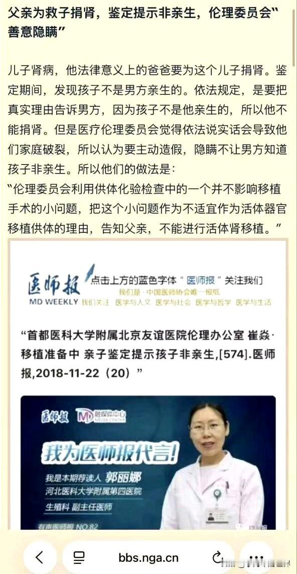 几年前(2018 年)的事,一男子打算捐肾给儿子,却发现儿子并非自己亲生。 当时儿子患病,急需进行肾移植手术。父亲毅然决定捐出自己的肾。然而在进行肾匹配度验证时,却发现儿子并非父亲亲生,而是母亲出轨他人所生。 正常情况下,医院理应将这一真相告知男子。但首都医科大学附属北京友谊医院“伦理办公室”却以告知真相会导致家庭破裂为由,决定隐瞒此事。 好吧,这理由似乎也说得过去,隐瞒就隐瞒吧。 可奇葩的是,医生这边以会导致家庭破裂为由不告知男子真相,另一边《医师报》却发文对这种隐瞒行为进行赞颂。 既然都选择隐瞒了,为何还要登报发文表扬,这是什么操作? 把违背伦理的事当作伦理典范来报道,伦理办公室恰恰最缺的就是伦理。 他们只考虑到可能会导致家庭破裂,却完全没意识到隐瞒此事对父亲造成的伤害。 明明是母亲犯的错,却要父亲来承受后果! 他们为所有人都考虑到了,唯独忽略了那位父亲! 这算什么狗屁伦理。 嘴上说着伦理,实际做的却是违背伦理的事! 这位父亲应该起诉医院。 医院没有权利,伦理办公室更没资格去决定他人的权利。 简而言之,医院的所作所为,既违背伦理,也触犯法律。 从医学角度来看,隐瞒孩子非亲生的事实,若找不到孩子的亲生父亲,可能会影响孩子的肾移植手术,甚至危及孩子的生命安全。