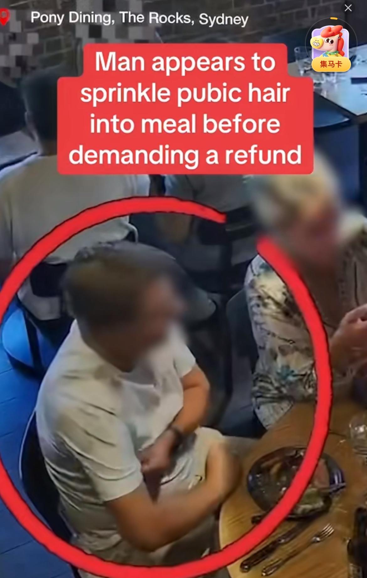 悉尼餐厅,一家六口就餐时投诉食物里面有毛发,要求餐厅退款,餐厅老板查了监控发现男子往自己腋下拔毛,然后投放到食物里面,男子想要白吃白喝的行为被识破,只能灰溜溜的结账走人 得亏有监控,要不然都不知道有多少白嫖党了