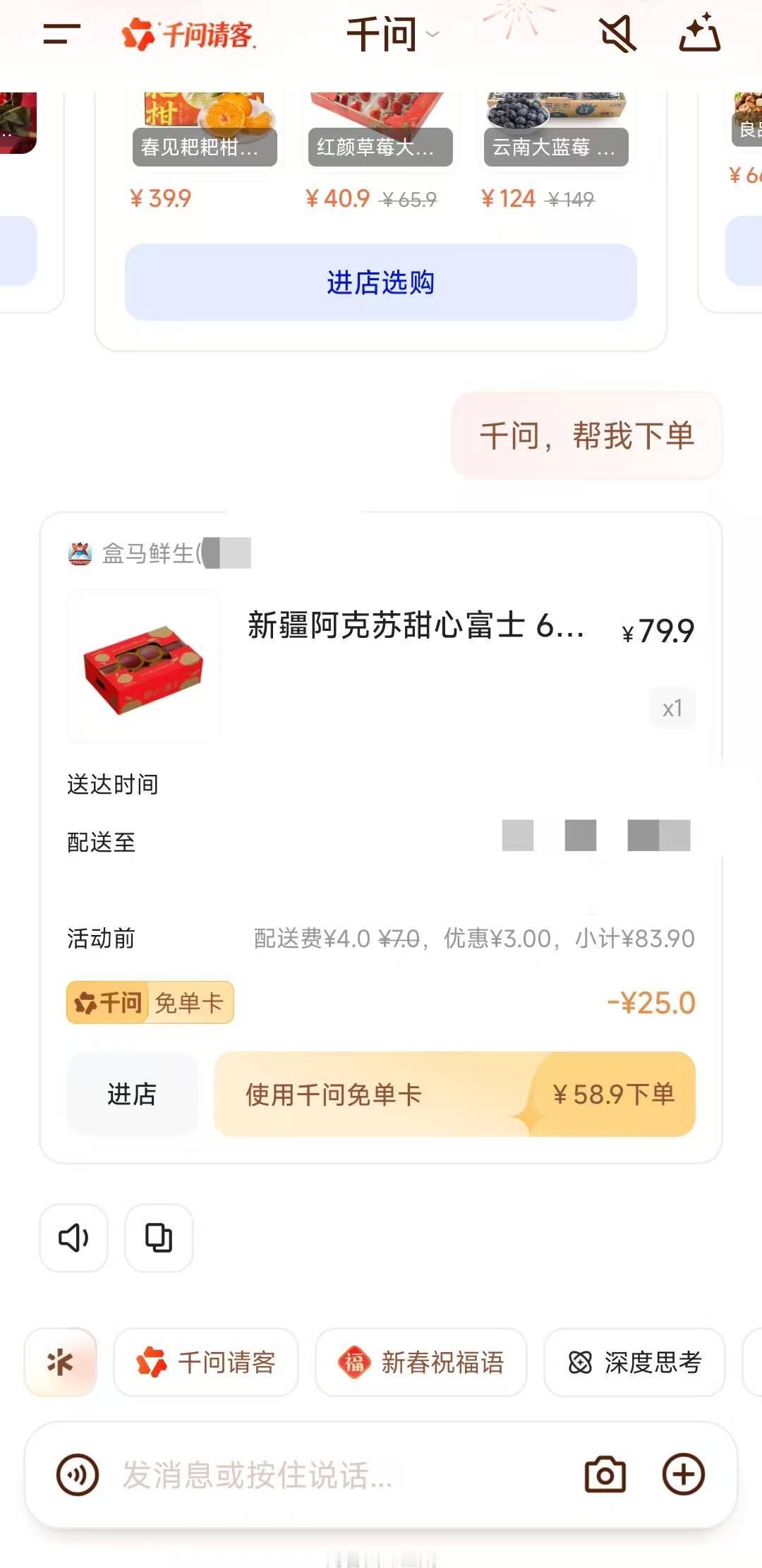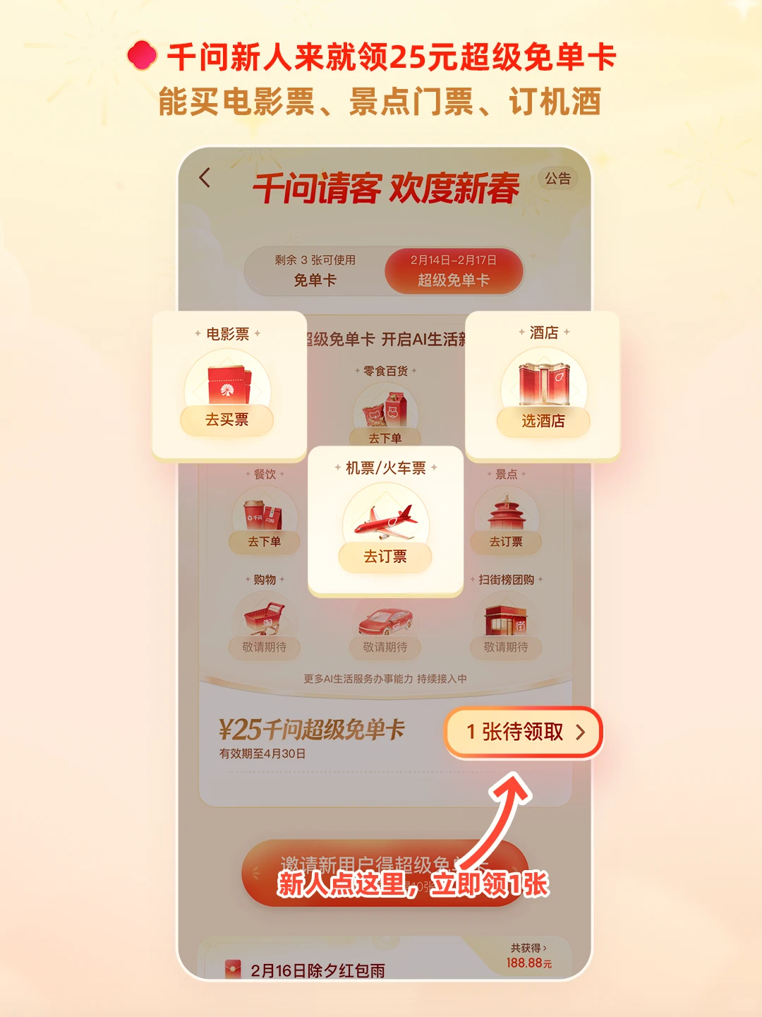 今年的年货都是AI一手包办我妈以前总觉得手机买东西不靠谱,结果看我买的水果用完超级免单卡后省了25元,现在天天去拉好友凑超级免单卡。而且现在除了水果,还能买电影票、门票和机酒,这下我妈现在彻底被千问征服了哈哈哈!千问超级免单卡能买年货能买票