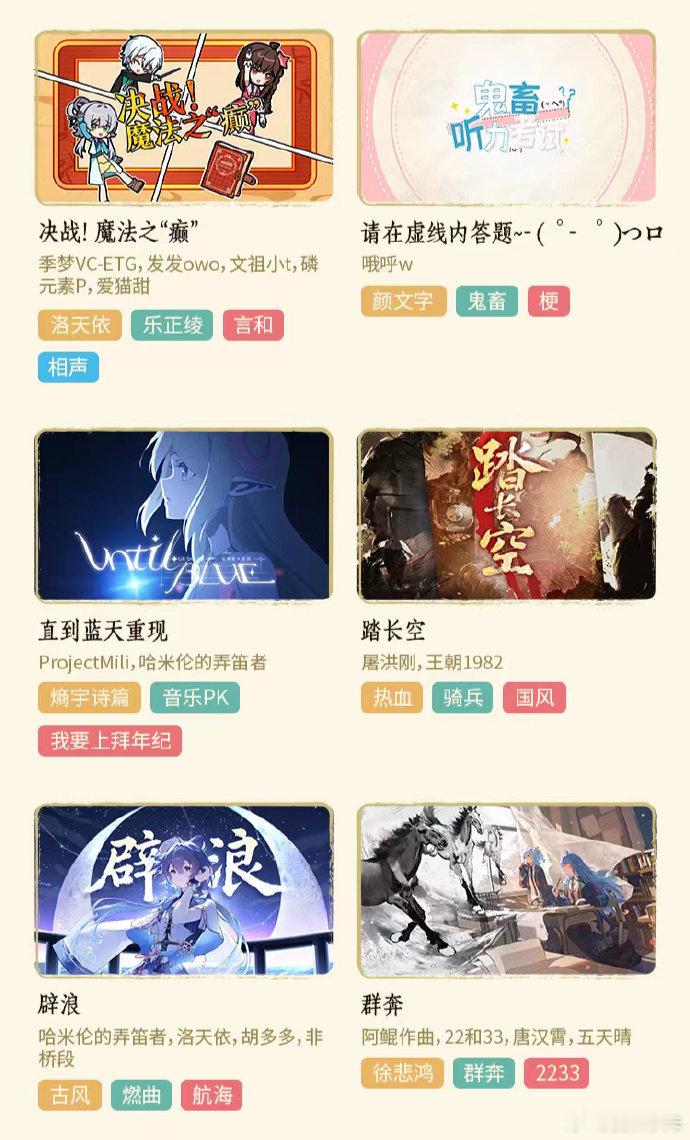 二次元春晚节目单屠洪纲唱武侠,李常超燃古风,唐汉霄空灵声,三大神嗓承包你的春节歌单!徐悲鸿名画破壁,洛天依新歌首唱,凡人二创曲走心催泪。一句话总结:今年二次元春晚,错过等一年