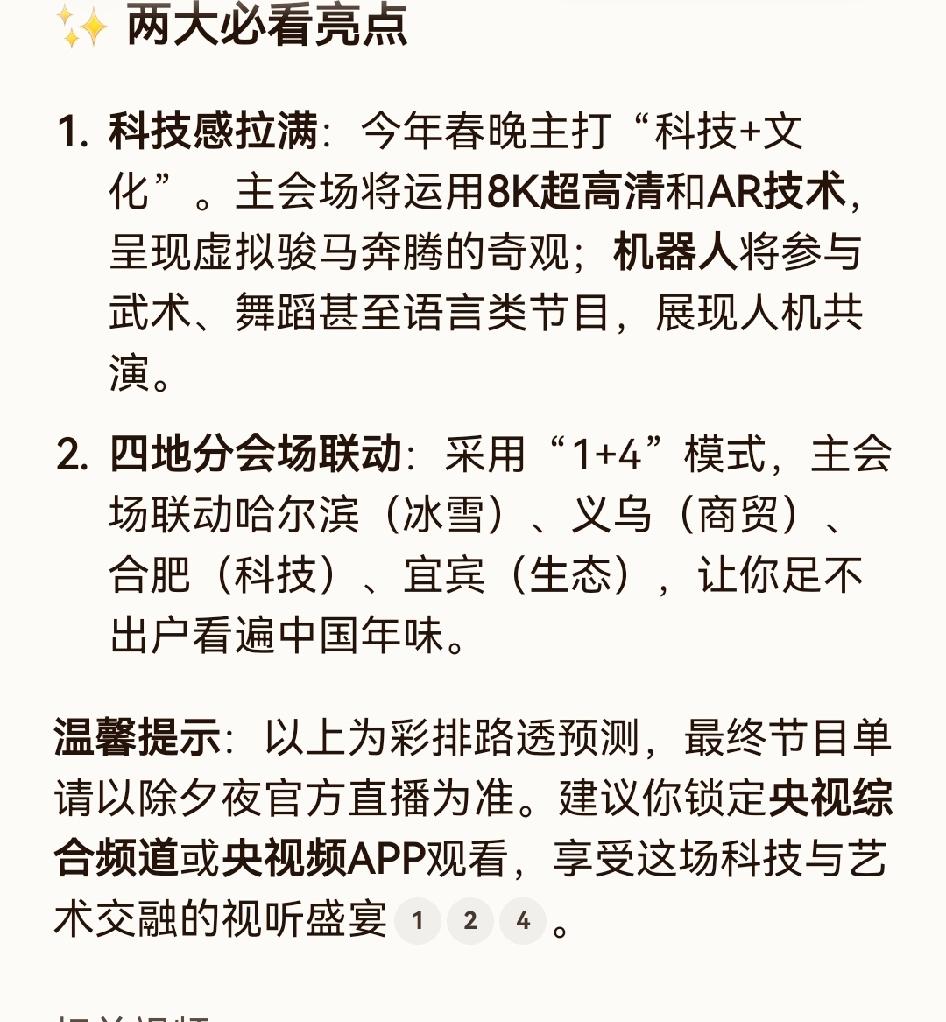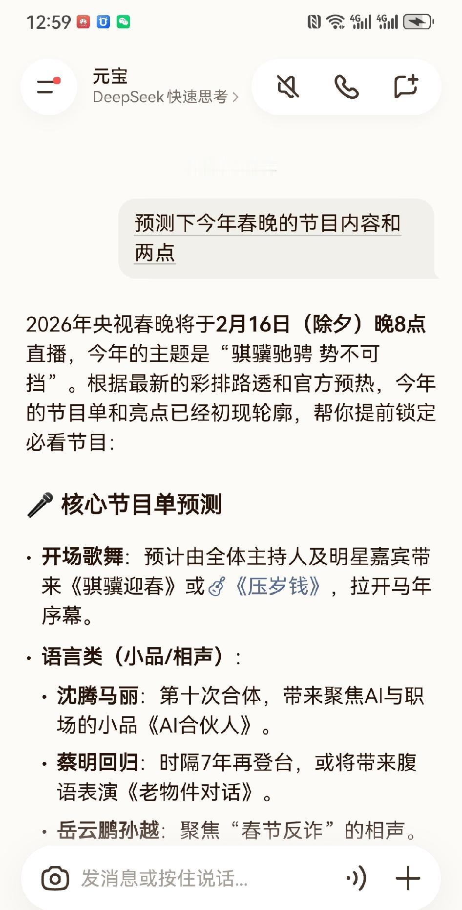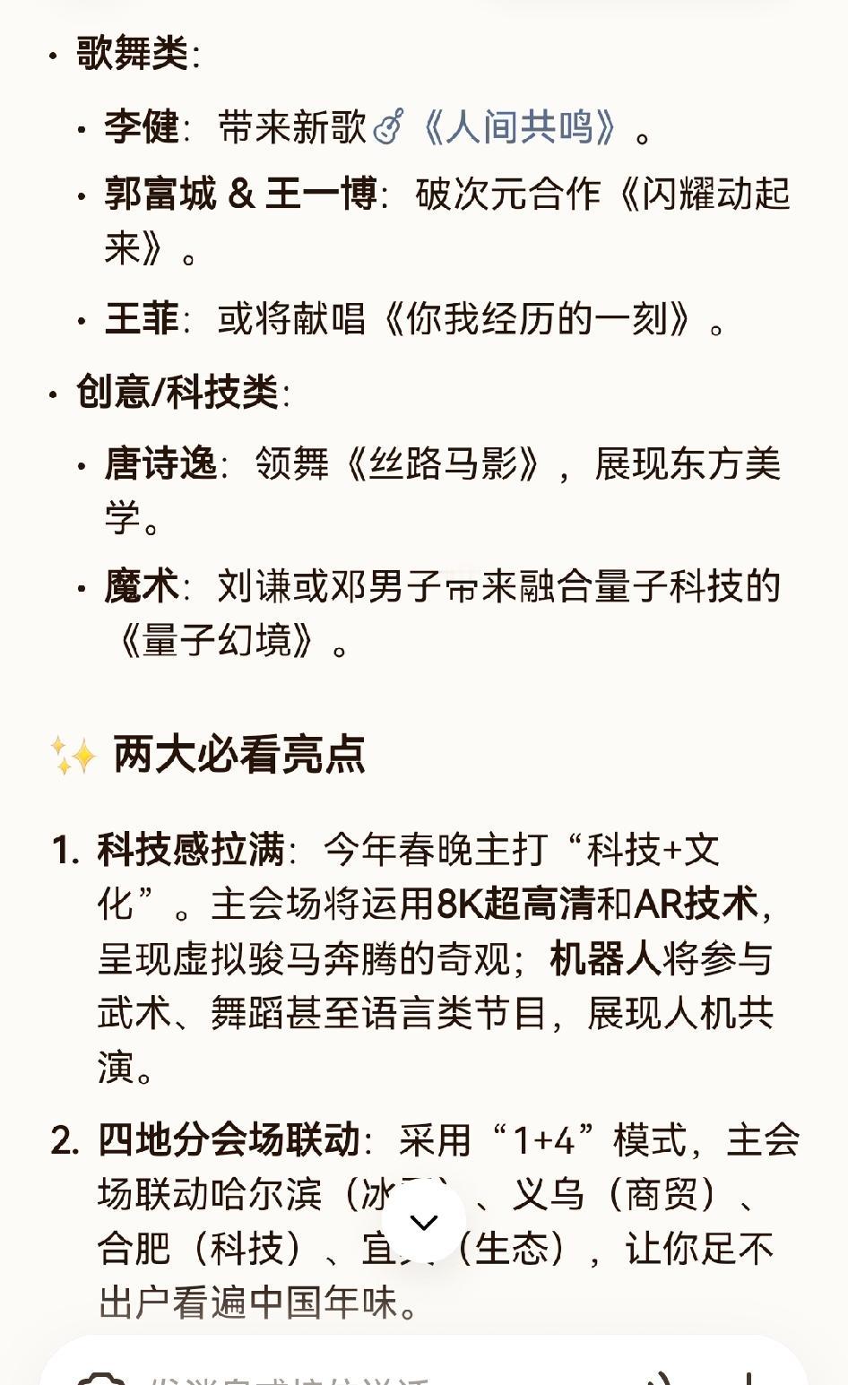 用Ai元宝预测了一下,今年春晚的节目内容和亮点。 1、语言类的亮点是:沈腾马丽、蔡明、岳云鹏孙悦。 2、歌舞类是:李健、郭富城、王菲。 3、其他:刘谦。 这么一看,这些节目实在没啥值得期待。不过科技感还是值得期待,希望有去年类似“宇树科技”这样的亮点。