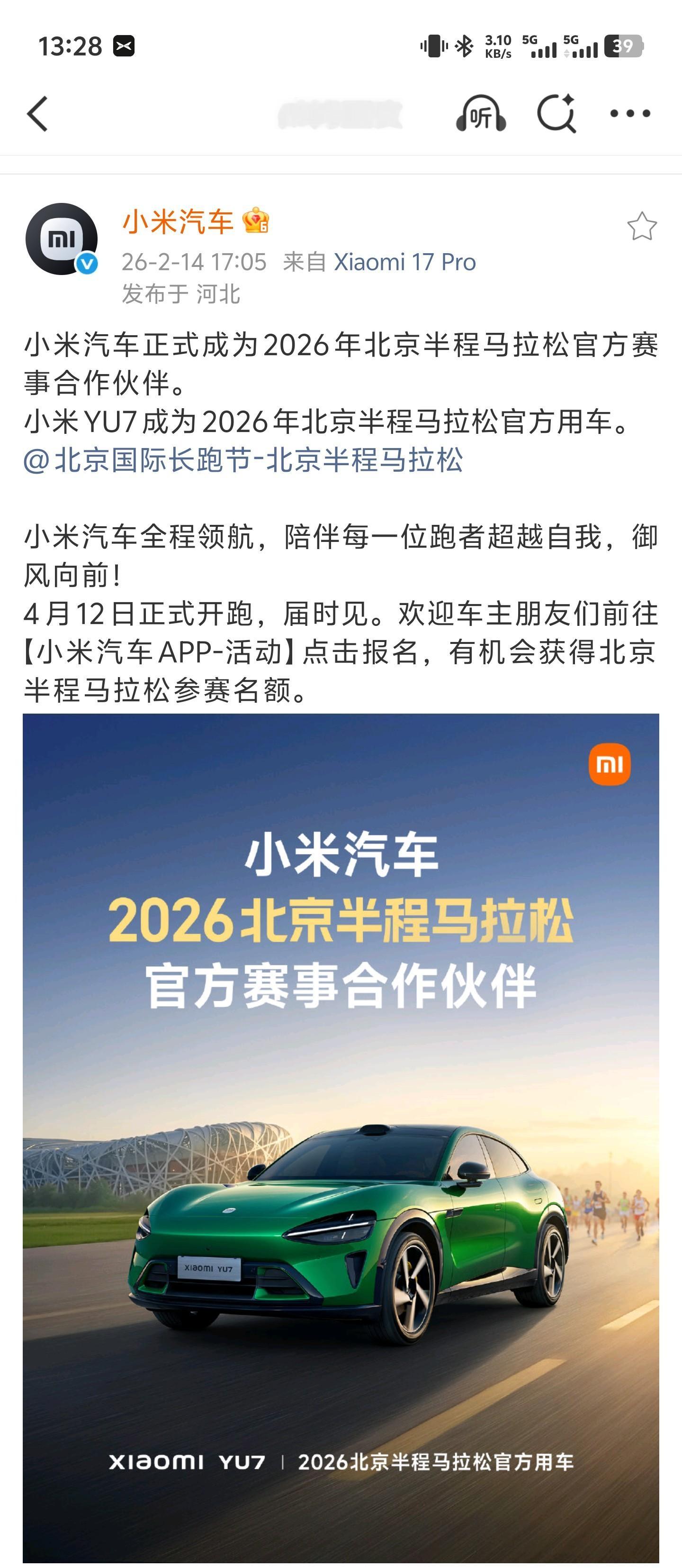 作为北京马拉松官方指定用车,不是光有钱就行,车辆的品质和稳定性也需要保证才行,这种级别的赛事对保障车辆的要求是零容错,马拉松的“官方指定用车”不是摆着看的摆拍用的,它要承担前导、计时、医疗各种重任,所以一般都会选择大品牌。去年官方指定用车是保时捷,今年换成了小米汽车,国产汽车顺利接棒,值得称赞。我参加北马那些年都是北京现代汽车,我15年16年参加的。已经快十年了!