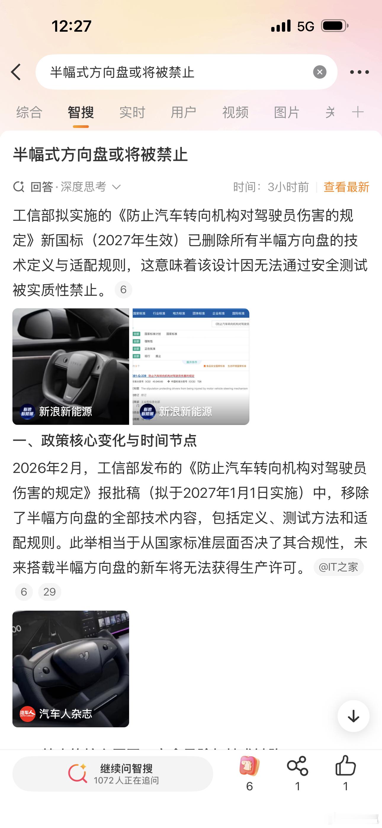 半幅式方向盘或将被禁止好消息啊,有些东西可以创新,有些真没必要创新。举个例子,筷子发明上千年了,依然保持原样,简单好用。半幅式方向盘真的没必要