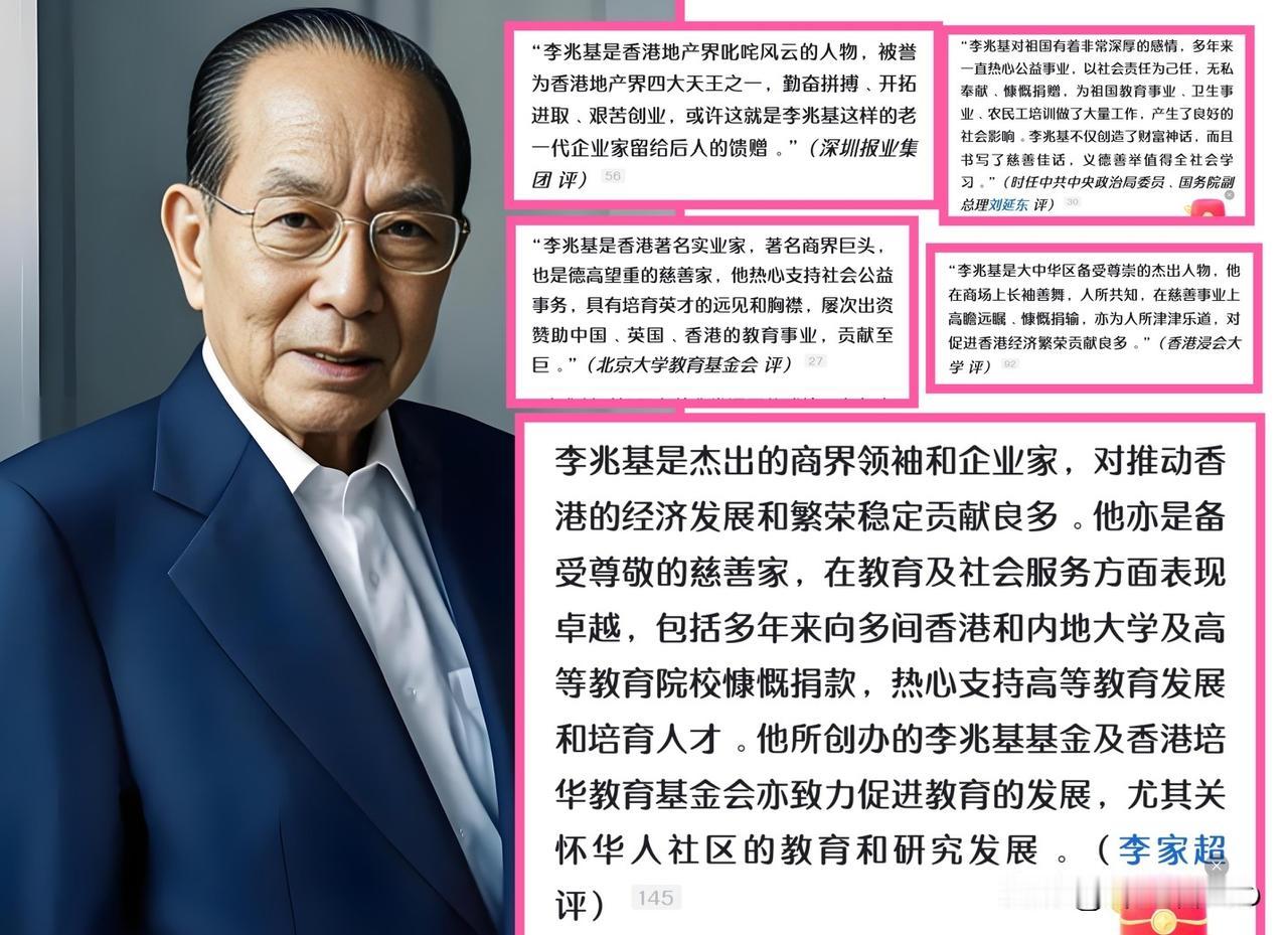 李家诚父亲——李兆基(香港四大家族之一) 从20岁只身闯荡香港,到香港四大家族之一的传奇人生,成为一代商业传奇。 李兆基,1928年出生,顺德大良人。 1948年,带着1000元只身到闯荡香港,靠外汇兑换业务和黄金买卖生意起家。 后转行五金、进出口贸易生意,而后抓住商机,成立恒基地产,进军地产行业,经营得风生水起。 李兆基,一路拼搏,靠着自己敏锐的商业嗅觉和头脑,生意横跨地产、能源、酒店、交通及零售等行业,从单枪匹马发展到成为香港四大家族之一。 直到2019年,91岁的李兆基才把大旗交给长子李家杰和次子李家诚接棒。 2025年3月份,李兆基仙逝,享年97岁。 李先生的事迹,得到了社会各界的高度好评,在他逝去后,时任港督的李家超发言致哀,给出了极高的评价:“李兆基博士是杰出的商界领袖和企业家,对推动香港的经济发展和繁荣稳定贡献良多。他亦是备受尊敬的慈善家,在教育及社会服务方面表现卓越,包括多年来向多家香港和内地大学及高等教育院校慷慨捐款,热心支持高等教育发展和培育人才。” (信息来源:百度)
