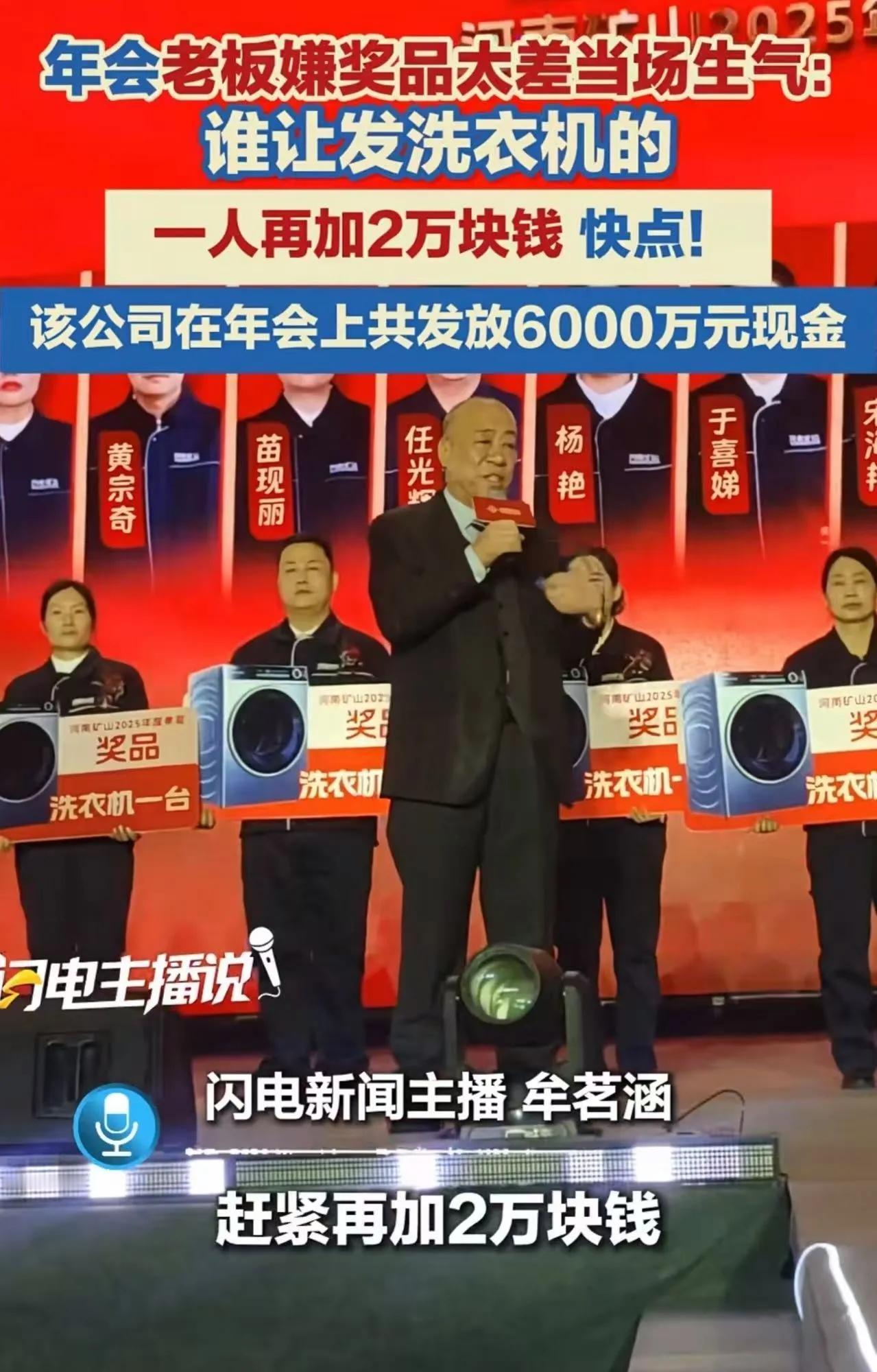 河南一企业年会现场,老板看到奖品是洗衣机,当场发飙怒斥财务:谁让发的?太掉档次了!每人再加两万现金!网友:这样的老板哪里找? 河南长垣的夜晚,寒风刺骨,可矿山集团的年会现场却热得能把房顶掀翻。 2月13日,公司正在表彰24位“年度孝星”——这个奖是专门发给孝敬父母、家庭和睦的员工。当董事长崔培军走上台,看到摆在台上的奖品时,脸上的笑容瞬间僵住了。 “这是什么?”他指着那台洗衣机,声音陡然拔高,“谁让发洗衣机的?!” 全场600多人瞬间鸦雀无声。 崔培军一把抓起话筒,直接开怼:“往年不都发金项链、金戒指吗?是不是看今年黄金涨价了,你们想给我省钱?换成洗衣机?开什么玩笑!这也太掉档次了!” 台下员工面面相觑,有人已经开始偷偷录像。 可接下来的一幕,让所有人直接破防。崔培军压根没给财务留解释的机会,当场拍板:“洗衣机照拿!另外,每人再加两万现金! 立刻安排!” 话音未落,现场直接炸了!有人激动得站起来鼓掌,有人抹着眼泪笑,还有人在下面扯着嗓子喊“崔总万岁”! 这还没完。 当天年会的“数钱环节”更是硬核——桌子上直接堆着6000万现金,员工上去亲手点钞,点多少拿多少。往年只给3分钟,今年崔培军大手一挥:“时间延长到15分钟!”他甚至还走到选手身边,往员工手上沾点水,方便点钞。 有员工接受采访时笑得合不拢嘴:“15分钟啊,手都数抽筋了,但心里美得很!” 更让人意外的是,这24位“孝星”只是开胃菜。当天累计发放现金6000万,全年年终奖预计高达1.8亿,占到企业全年利润的三分之二。 消息传到网上,评论区直接炸锅: “我刚在公司年会抽了个保温杯,还说是‘实用’……现在看着这条新闻,默默关掉了抽奖链接。” “两万块+洗衣机+金饰?这哪是发奖,这是给员工全家发安心!” “我们老板天天喊降本增效,年会奖品从充电宝降到了抽纸,看完这个我只想问:这样的老板哪里能领?” 但也有人酸:“不就是作秀吗?有钱谁不会发?” 可了解的人都知道,崔培军从2004年就开始这么发,一発就是20多年。你见过哪个“作秀”能演20年? 更绝的是这家公司的管理方式:几千名员工不打卡、不考勤,全公司只有12条管理规定。下雪路滑可以带薪休假,三夏农忙发放专项奖金,夏天酷暑调整上班时间。 崔培军自己说过一句话:“打到卡里就是冷冰冰的数字,现金拿在手里,那种开心是不一样的。” 他还回应过作秀质疑:“嘴长别人身上,我对得起自己的良心就行。我不玩抖音、不带货、也不想当网红。实实在在的,比打卡里有温度。” 说实话,作为旁观者,我看到的不只是老板大方。当别人都在算“人力成本”,他在算“人心温度”;当别人压缩福利求利润,他加大投入换忠诚——这不是傻大方,这是最高明的长期主义。 最后留个话题给大伙儿唠唠:你今年年会抽到了啥?遇到过最寒酸的奖品是什么?欢迎评论区晒晒! (综合极目新闻、大河报、大象新闻等多家媒体报道)