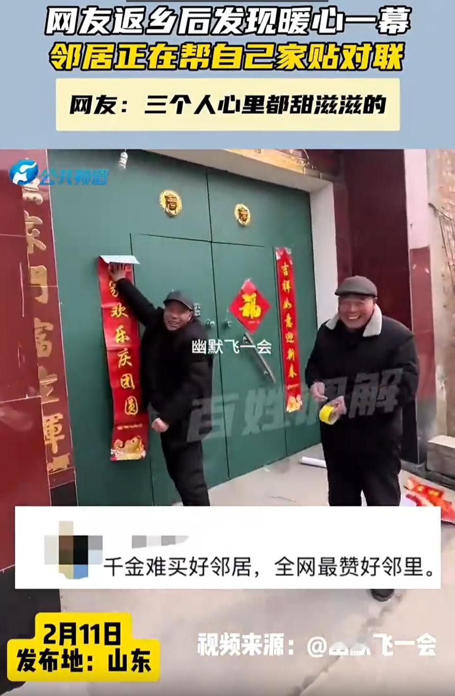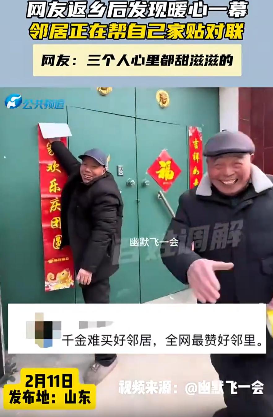 破防了!山东,一男子过年回老家,到了村口离得远远就发现有两个人在他家门前,男子还疑惑对方要干嘛,可靠近一看,竟然是邻居帮自己家贴春联呢,邻居看他回来也是相视一笑,男子当场差点落泪了 男子常年在外地工作生活,家里的老房子都空着,基本一年就等过年的时候回来一次,当天回来时,远远就瞄见自家老房子门口站着俩人。他当时心里还咯噔一下,寻思这谁啊,在自己家门口晃悠啥呢? 等车开近了,把眼镜扶正了一瞅,鼻子一下子就酸了 原来是隔壁那两位老邻居,正踩着凳子,帮他家贴春联呢。地上是刚撕下来的旧对联,门上已经贴好了新的大红福字。俩老人听见车声,回头一看是他回来了,也没说啥,就冲他笑了笑,拍了拍手上的灰,走过来跟他握了握手 男子当场差点没绷住。他在外面城市里租房住,一年到头也就过年回这么一趟家。老房子没人气儿,大门常年锁着。要不是邻居记着这事儿,他那两扇门过年就得光秃秃的,多冷清。可偏偏有人替他想到了,不光想到了,还动手给办妥了 就这么个事儿,说起来也不大,可就是让人心里热乎 我们老话常讲,远亲不如近邻。搁以前可能就是个说法,真碰上事儿了才明白,这话的分量有多重。亲戚再好,隔得远了,过年打个视频问声好,也就那样了。可邻居呢,是那个你不在家的时候,替你看着门的人,是那个下雨了帮你收收院子里东西的人,是那个过年了,怕你家冷清,顺手给你贴副对子的人 这位兄弟是幸运的,他在老家的门口,还有人替他守着这份温度。也希望咱们每个人,不管是在村里还是在城里,都能遇到这样的好邻居。要是遇着了,咱也得记着人家的好,有机会了,也给人家搭把手