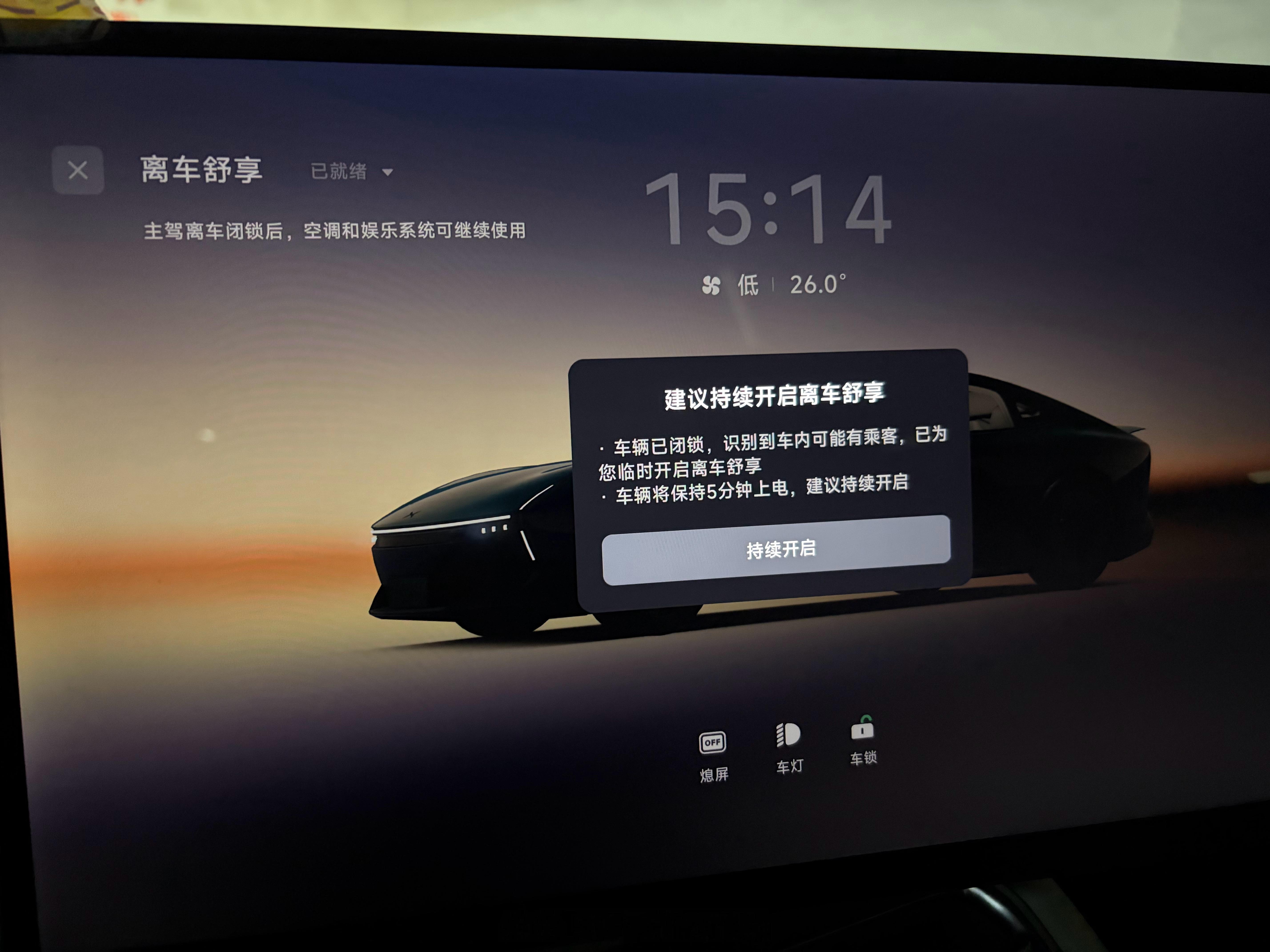 回来发现自动开启了离车舒享,空调和娱乐系统保持工作,这就是智能化,只要用上一次你就会觉得这车做的真好开着小鹏回家过年