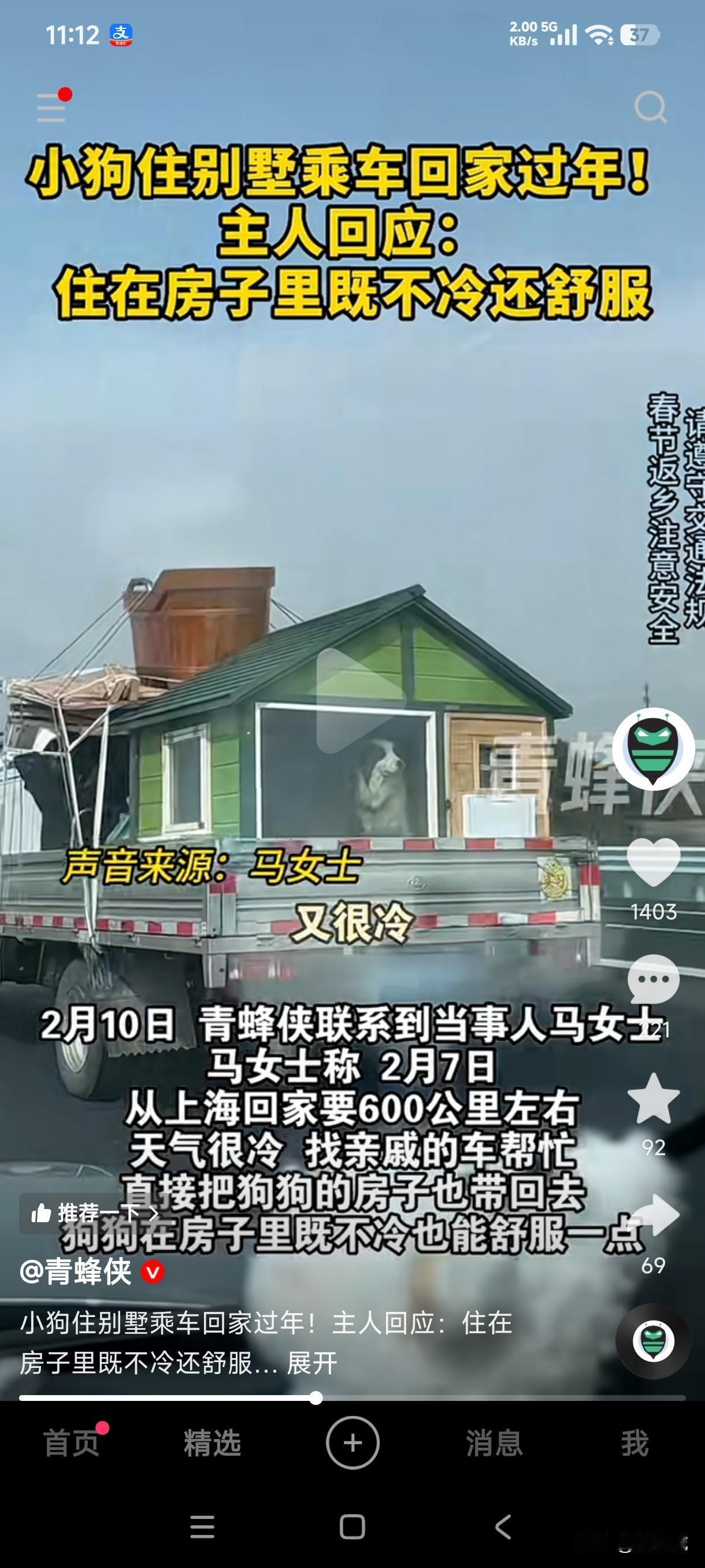 第一次见到狗住别墅被主人带回家过年的,这有钱人的生活真是让我大开眼界了,当有钱人的一条狗既享福又见世面不是吗? 女子回家过年时找了一辆货车把狗和狗窝一起带回了家,货车拉着狗子走在前面,她开着自己的车跟在后面,这场面是不是也太霸气了,狗子在货车上的别墅里既暖和又不受冻,主人在后面给狗子保驾护航,这狗的待遇比有些人待遇都好,这让我想起有个网友带着自己的两只狗子回家过年,把狗子放在两个小桶里挂在车的屁股后面,这两者比起来一个是天堂一个是地狱的区别,果然跟着什么样的人就过什么样的日子不是?人既是如此,狗更是如此不是吗?