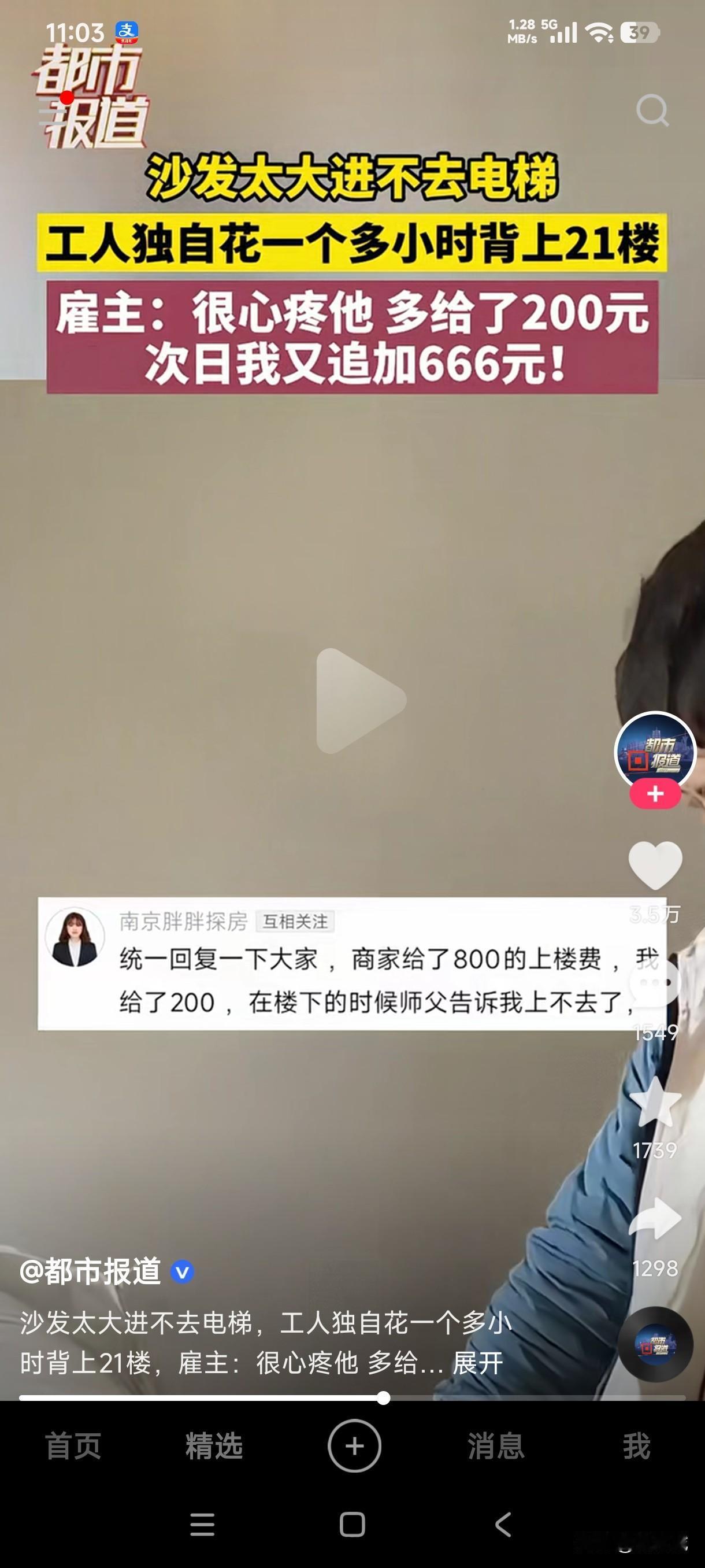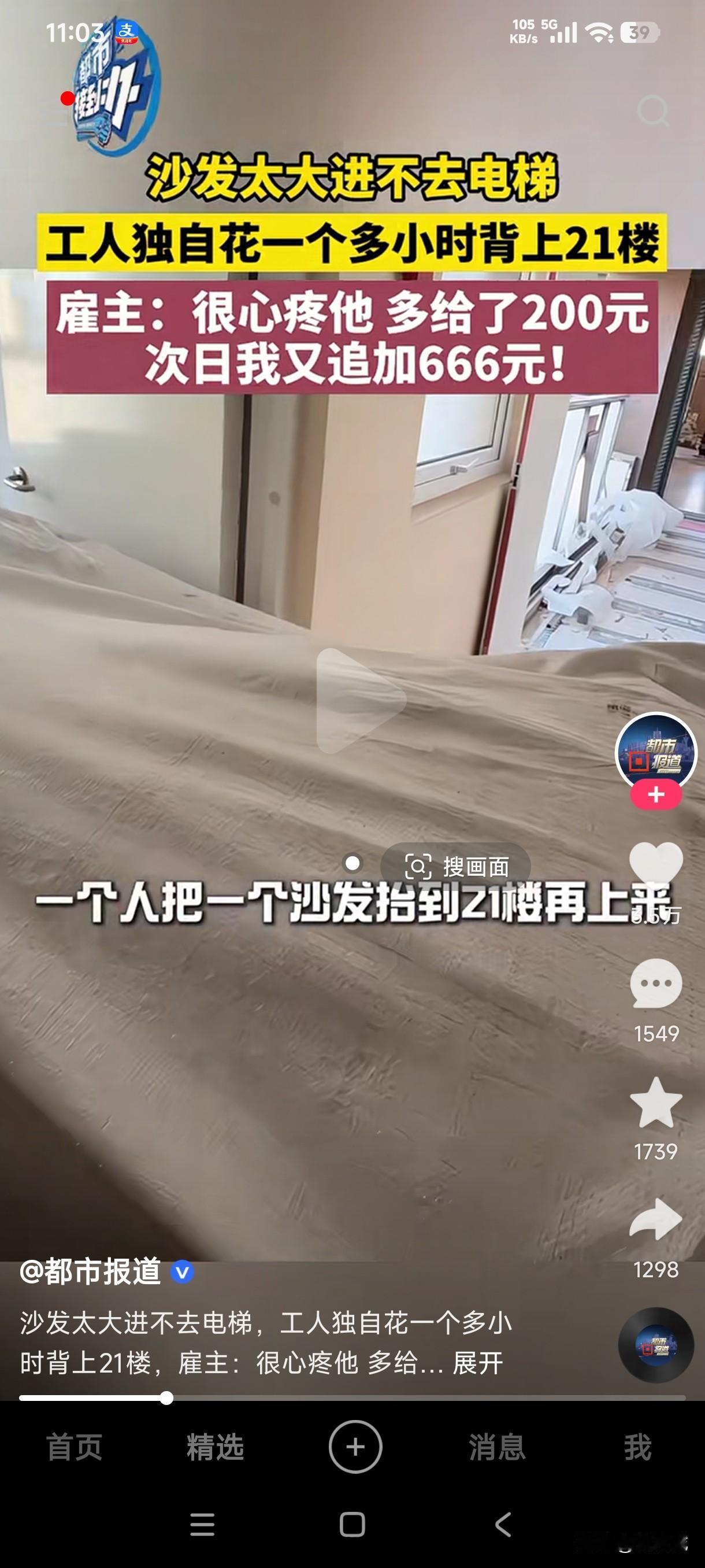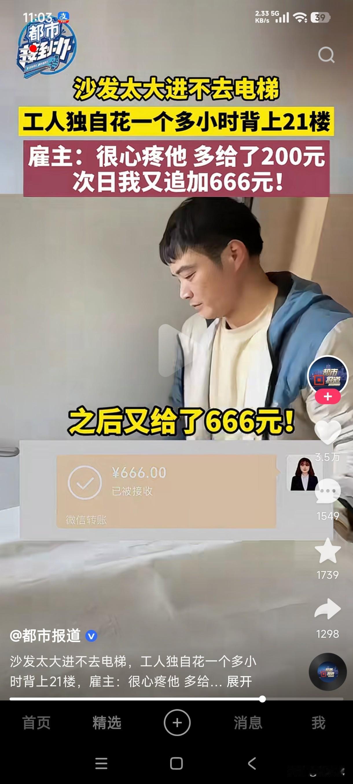男子给货主家送沙发,由于沙发太大电梯里面进不去,男子独自一人花费1小时把沙发背上了21楼,货主说一个人爬上21楼都费力,他居然把那么大的一个沙发背上了21楼,货主又问男子累不累,男子苦笑一下说不累…… 货主把这惊人的一幕发到网上后,得到了很多网友的共鸣,大多数网友说若不是生活所迫,谁愿意干这种累死人的体力活,说不累肯定是假的,只是为了生活所迫咬牙坚持罢了,商家给了800的上楼费,女货主给了200,她看到很多网友都在心疼这位送货上楼的男子,后期她又联系到男子又给了666元,男子也是凭体力挣钱,有些人什么东西都不拿,爬楼都费劲,他把那么大的一个沙发居然独自背上了21楼,真是让人既心疼又佩服!