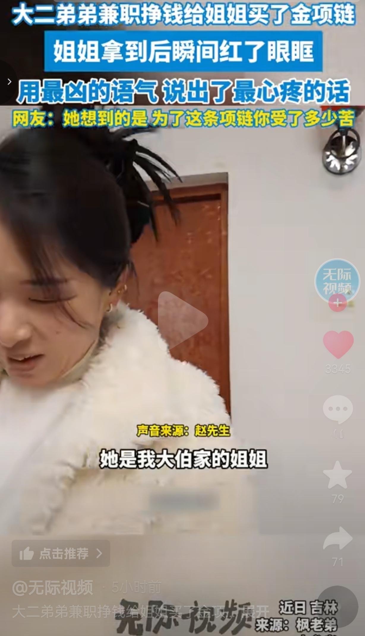吉林的一户人家里,姐姐刚打开门,就看见大二的弟弟站在门口,笑着说:“给你个好东西。” 姐姐还没反应过来,弟弟就从兜里掏出一个红盒子,里面是一条金项链。 姐姐的脸一下子就变了,红着眼眶,用最凶的语气骂他:“你有病吧!买这玩意儿干啥呀?金子多贵呀现在呀!” 弟弟挠挠头,笑得有点不好意思:“从小到大没给你买过东西,第一次给你买东西,挣钱了,给你买的。” 姐姐的眼泪“唰”地就下来了,嘴上还在骂:“你有钱你自己留着呀!”,手却轻轻摸着那条项链,一遍又一遍,声音都在抖:“这多少钱啊……” 后来才知道,这个弟弟其实是大伯家的孩子,姐姐从小就一直照顾他,对他特别特别好。他说,准备这个礼物的时候,心里又兴奋又激动,挺期待姐姐会有什么反应,就想把自己能给的,都给这个一直疼他的姐姐。可真看到姐姐红着眼眶骂他的那个反应时,他心里也是一酸,瞬间就懂了:姐姐是真的心疼他。 底下的评论区,有一条高赞的话戳中了我:“她知道,她的这条项链你遭受了多少苦。” 视频里的弟弟还是个学生,他的钱是熬夜兼职、风吹日晒攒下来的,那条金项链,可能是他好几个月的生活费。他不是不知道钱难赚,他是知道,这个从小照顾他的姐姐,值得他把所有的心意都捧出来。 姐姐骂他“有病”,也不是真的生气,她是心疼弟弟的辛苦,是觉得自己何德何能,能被弟弟这么放在心上。她红着眼眶的样子,不是难过,是被这份沉甸甸的爱撞得鼻酸。 现在的人,总爱说“亲情淡了,人心凉了”。 可你看这对姐弟,弟弟用最朴素的方式表达爱,姐姐用最笨拙的方式回应爱。没有华丽的辞藻,没有昂贵的包装,只有一句“挣钱了给你买的”,和一句带着哭腔的“你有钱你自己留着呀”。 这才是最真实的亲情——它不完美,却足够滚烫;它不张扬,却足够深刻。 我们总在追求“更好的生活”,却常常忽略了身边那些最珍贵的东西。我们总在抱怨“没人爱我”,却忘了,爱一直都在,只是它藏在一句骂人的话里,藏在一条金项链里,藏在每一个平凡又温暖的瞬间里。