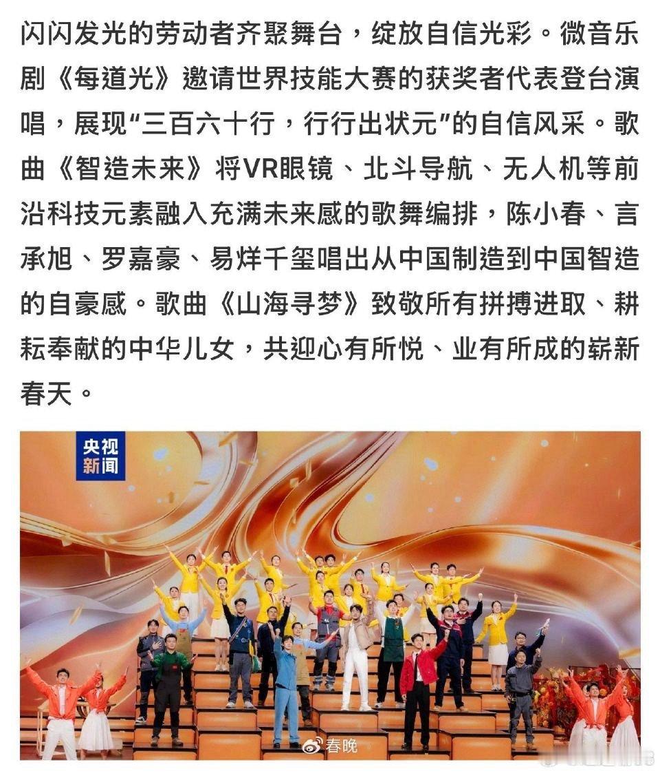 王铮亮五登央视春晚 从《时间都去哪儿了》到《每道光》,王铮亮五登春晚见证十二年轮回。今年他带着音乐剧buff回归,与世界技能大赛获奖者同台,唱出“行行出状元”的时代故事。除夕夜蹲一个!