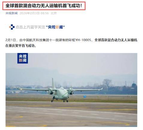 央视曝光了 2月3日,据央视新闻报道:由中国航天科技集团十一院研制的彩虹YH-1000S(2月1日)在重庆梁平首飞成功。要知道以前的无人运输机要么纯电动,要么纯燃油,纯电动续航短、载重小,纯燃油又费油、污染大,都是两难选择。 纯电动的无人运输机,目前市面上常见的大多载重只有几百公斤,最多不超过500公斤,能飞的距离也有限,一般只有几百公里,远一点的路程根本飞不了。比如一些小型纯电无人运输机,只能在城市周边短途运输,最多运点信件、小件包裹,要是想往偏远山区运物资,比如米面油这些生活用品,要么装不下,要么飞一半就没电了,根本满足不了实际需求。 而纯燃油的无人运输机,虽然能装重一点、飞远一点,但缺点也很明显,油耗特别高,每小时油耗能达到几十升,长期用下来成本很高,而且排放的废气多,污染环境,起飞和飞行时的噪音也大,靠近居民区的地方根本没法频繁起降,维护起来也麻烦,零件磨损快,每次维护都要花不少钱和时间。 这次首飞的彩虹YH-1000S,就解决了这些难题,它用的是既用油又用电的混合动力,把两种动力的好处都结合起来了,没有了各自的缺点。它的动力系统是和新能源汽车头部企业一起研发的,用的是类似家用混动车的2.0T发动机,经过改造后适应了高空飞行的环境,既能像燃油机一样飞远、装重,又能像电机一样省油、安静。 根据研制单位公布的数据,这款无人运输机能装1200公斤的货物,能飞1500公里,一次能连续飞行10小时,比之前和它类似的常规动力YH-1000无人运输机,载重提高了20%,能飞的距离增加了30%,起飞和降落需要的跑道长度也缩短了30%,不用很长的专业跑道,在普通的二级公路、硬质土路甚至草地上就能起飞降落,配上专用的浮筒套件,还能在水面上起降,配上雪橇套件,就能在雪地上起降,适应能力特别强。 而且它的混合动力设计还有很多实用的好处,飞行的时候,起飞、爬升这些特别费油的阶段,可以用电来辅助,平时飞行就用油,飞行过程中,燃油发动机还能给电池充电,电池充满后,单独靠电池就能飞30分钟,就算其中一个动力系统出了小问题,另一个还能支撑飞行,安全性更高。 另外,因为它共享了新能源汽车的供应链,零部件可以批量生产,研发和制造成本也降低了不少,后续维护起来也更方便,能节省不少开支。 这次首飞选在重庆梁平,也有实际的考虑,重庆多山地、多河谷,还有很多偏远山区,陆路运输很不方便,有时候往山里运物资,要绕很远的路,花费很长时间。有了彩虹YH-1000S,以后用来解决重庆山地物流的难题,再合适不过了。 而且这款无人运输机还有很多实用的功能,它能用于应急救援、海洋监测、海事监管、人工影响天气等很多领域,比如遇到洪水、地震等灾害,道路被冲断、阻断,它就能快速往灾区运食品、药品、帐篷等救援物资,不用等道路抢修好,能争取更多的救援时间。 这次央视突然曝光它的首飞成功,也能看出国家对这款无人运输机的重视,以及对低空经济、无人机产业发展的支持,相信用不了多久,这款无人运输机就能批量投入使用,真正服务于人们的生产生活,带来更多的便利。