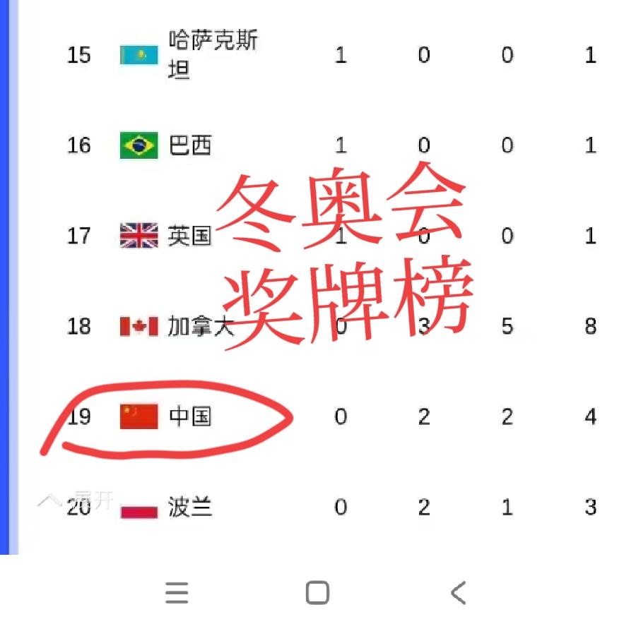 心塞,冬奥会奖牌榜,中国金牌还是大鸭蛋,排名越来越靠后了,从第3到第14,到如今第19,快跌出20名开外了,两银两铜,还是4枚奖牌,首枚金牌什么时候能够诞生,只能靠谷爱凌了,谷爱凌大跳台进入决赛,还有刘梦婷,希望有好消息!上届咱们本土北京奥运会冬奥会,中国还是前三,这现在怎么下降这么多,到底咋回事儿?是当时增加了我们擅长的项目,还是这一次发挥不行了?有懂行的人说说吗?