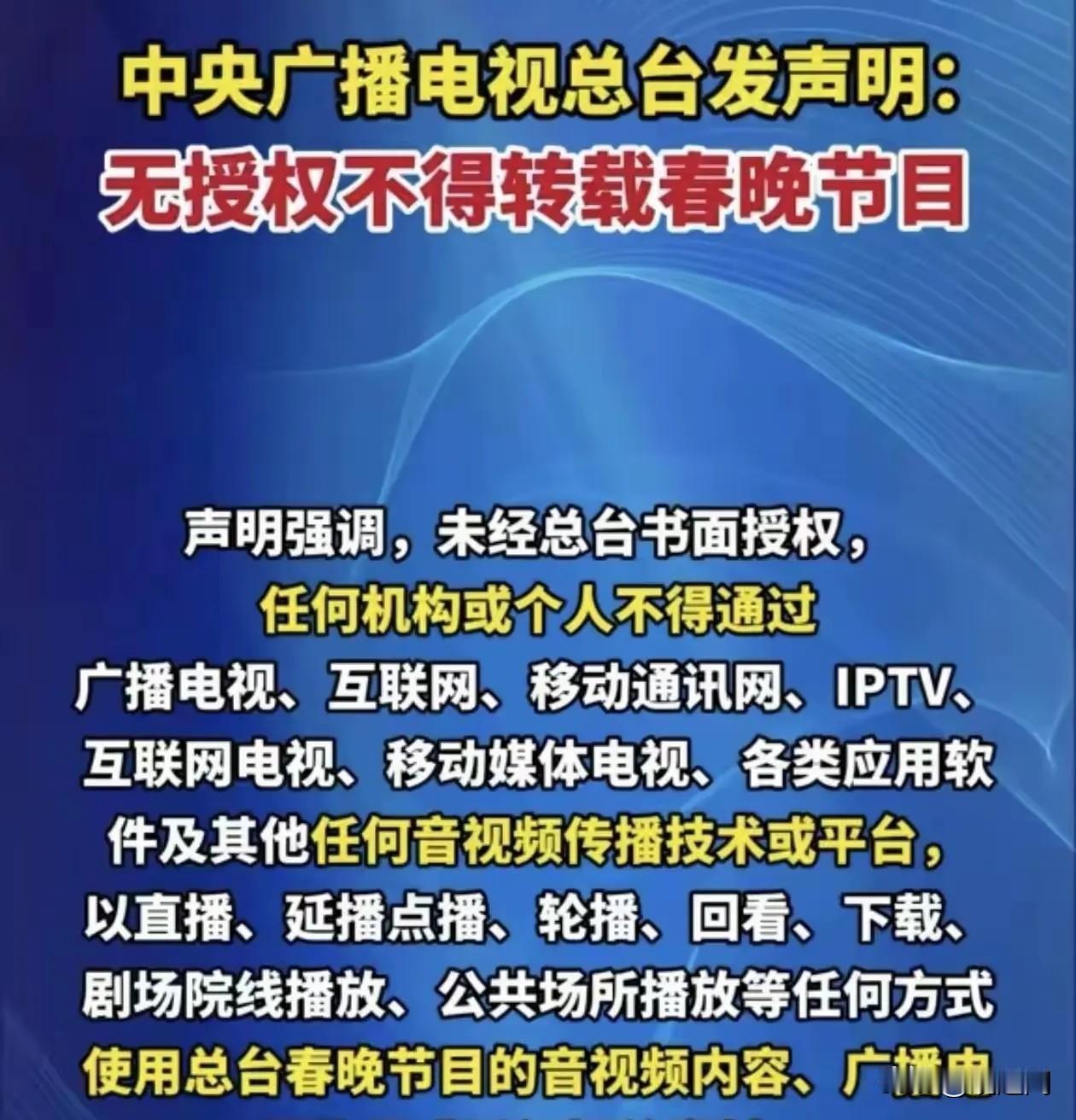 央视春晚为什么要发这样的声明, 现在的春晚争着看吗?有点想不明白! 至于大家吐槽的“不让下载”,其实是针对非法录播和二次传播。对于观众而言,在获得授权的正规平台观看,或是个人欣赏时的合理使用,并不在这个禁令里。这波操作本质上是为了维护版权秩序,和节目本身是否“抢手”无关。