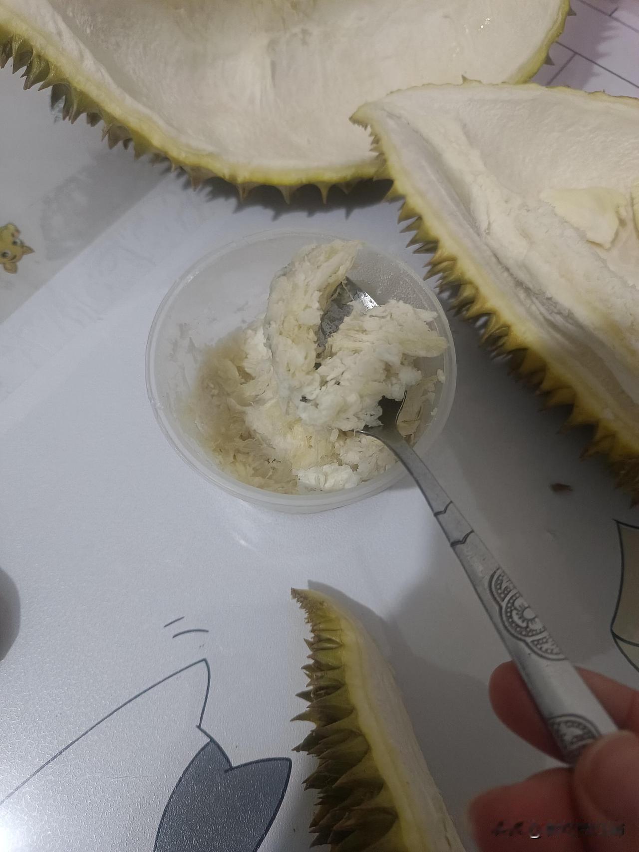 哎呦!我把要给外婆吃的大榴莲吃了,咋办呀 前天让对象给我买个榴莲回来,要大些的,别开裂明显的,准备去老妈那过年时拿去给外婆吃呢!他一回来我就闻到了浓浓的榴莲香味 他 : 你猜猜这多少钱。 我 : 两百多么! 他 : 快四百了。 我 : 啥!这么贵呀!你咋买这么贵的哦! 他 : 你说要买大点的呀!那人说这个皮要薄点呢! 然后昨天中午他回家去了,就剩我一个人在这,我是打算28再去老妈家过年的 昨天下午我闻着这榴莲味感觉好香呀!本来没想吃的,可闻到这味儿越闻越想吃,关键是我之前吃的都是一百多或者两百多一个的,这个贵这么多肯定口感更好吧!一冲动我就打开了。昨天上午吃了块中等大小的,昨天晚饭没吃,吃了块比较大的,今天上午也吃了块中等大小的,下午吃了块蛮大的当晚饭,还剩一块中等大小的明天吃 哎呦!真的好好七耶!吃的是挺开心的,可这是他给我外婆买的呀!却被我吃了,我都不敢跟他说呢 那吃了也没办法了,明天去买点别的啥给外婆吃吧!榴莲我是不买了(我太抠门了舍不得自己花钱买哦)