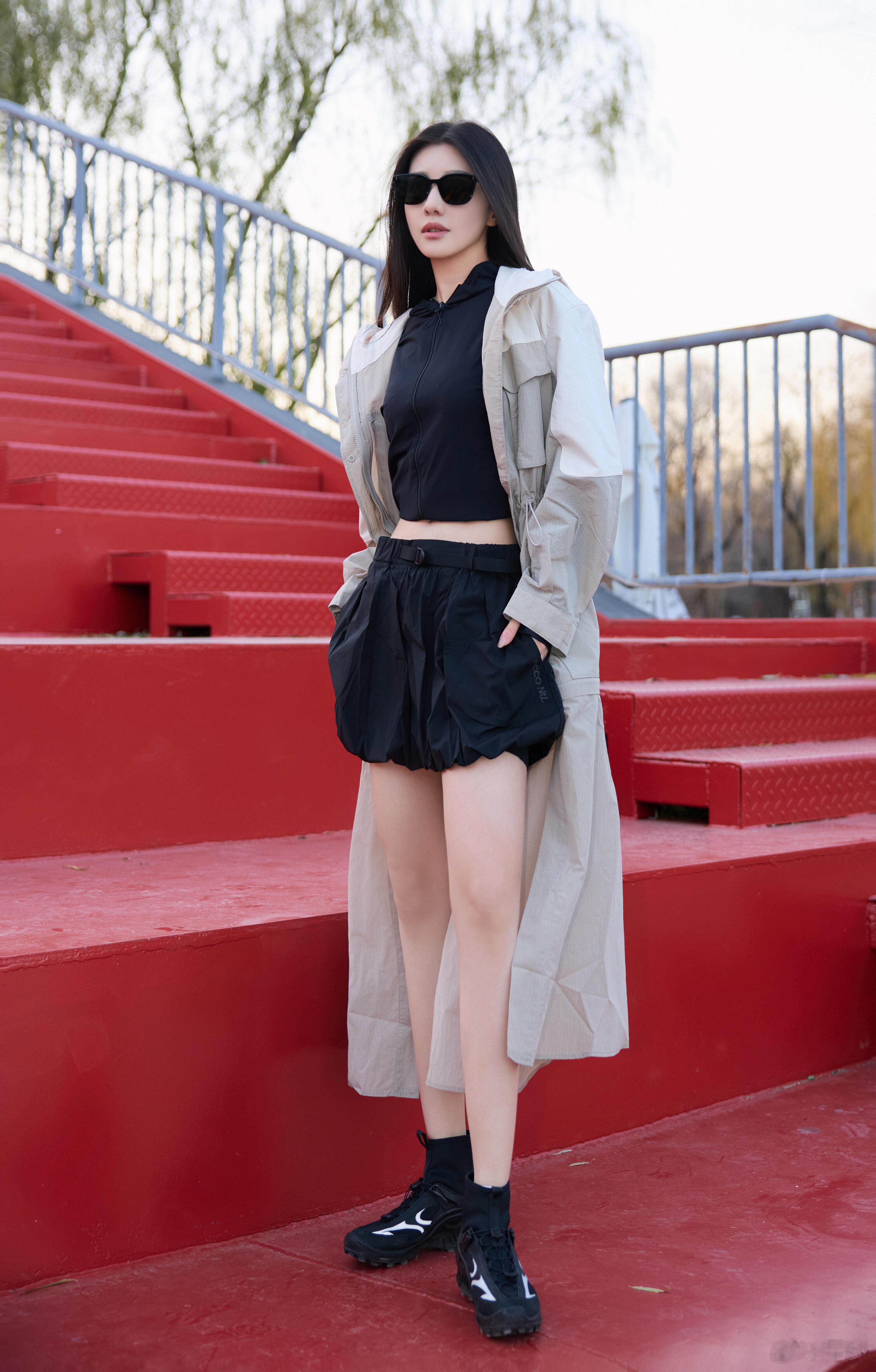 刘亦菲的穿搭简直堪称运动美学的典范。内搭是黑白撞色的运动bra,阿迪达斯的经典l