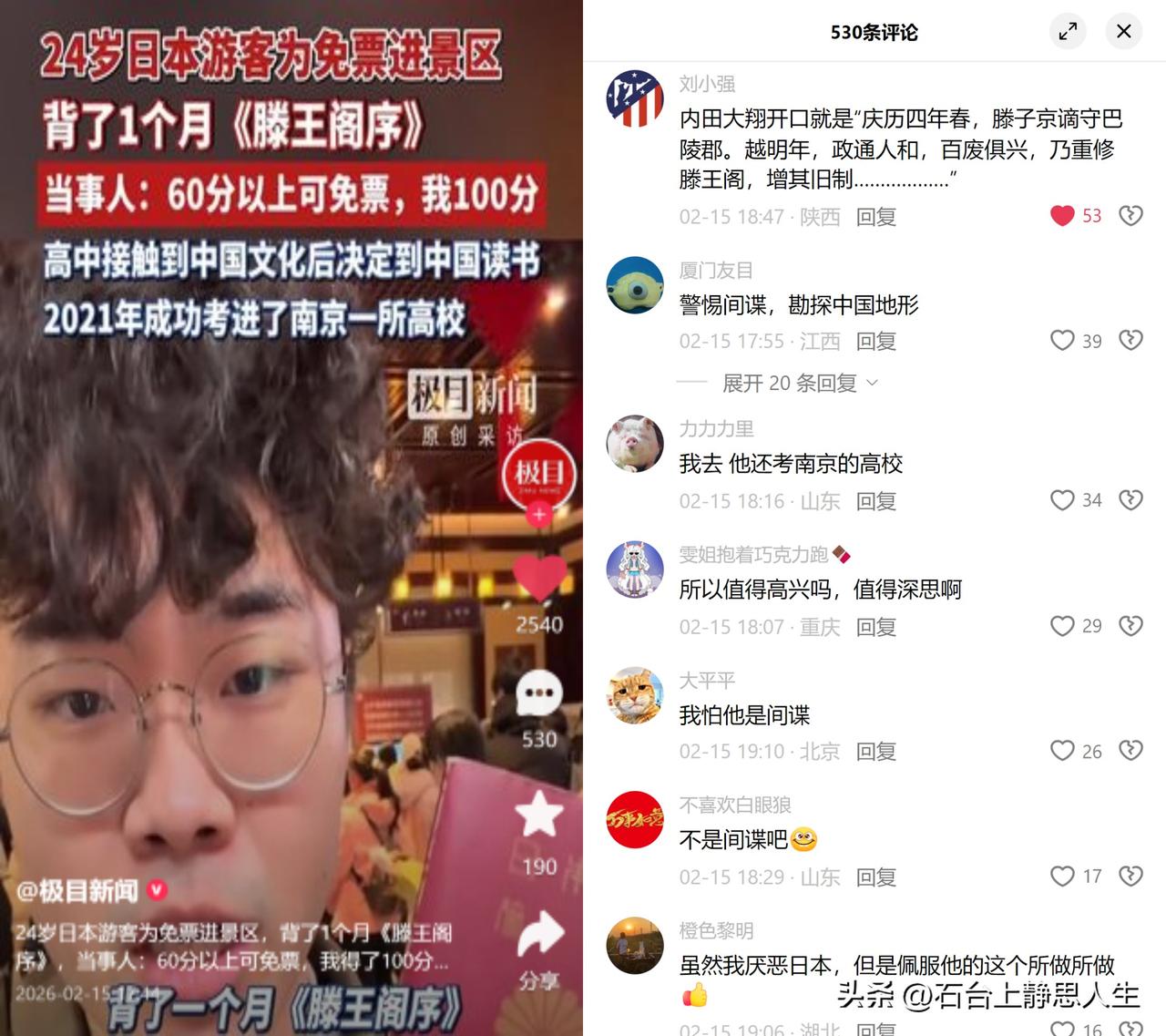 日本留学生内田大翔,背古文拿满分免票 24岁的他是南大留学生,为了滕王阁免票,提前1个月狠下了功夫。 每天早8点在校园晨读30分钟,给孤鹜、遄飞标注音和典故,还找老师纠正朗诵语气,最后真背出了100分。 他可不是三分钟热度,2023年拿中文朗诵特等奖时,评委说他比很多中国学生更懂文字温度。 视频里分享南京鸭血粉丝汤时,那雀跃的表情,一看就是真心爱这烟火气。 大家惊叹他的中文功底,有人却暗暗质疑他动机不纯,甚至怀疑他的身份。 就因为他是日本人,在南京读书,连喜欢中国文化都要被先入为主贴标签? 说到底,这是我们心里的历史创伤,催生了信任防御反射。 可文化的共鸣本就该跨越国界啊,比起捕风捉影的怀疑,不如多看看他眼里对中国文化的光,那种纯粹的热爱,装不出来的。