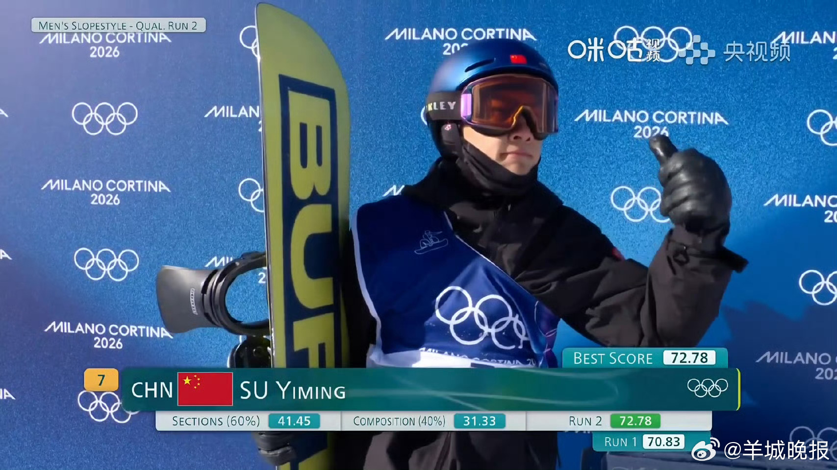 #苏翊鸣晋级坡障决赛##苏翊鸣预赛第8# 米兰-科尔蒂纳#冬奥会#单板滑雪男子坡障技巧预赛,两轮比赛结束,最终72.78分排名第8,晋级决赛。祝贺!#国际雪联回应谷爱凌吐槽##单板滑雪男子坡障技巧预赛##苏翊鸣第二滑72.78分##张博恒祝冬奥健儿新春快乐#(编辑:杨雨桐;审签:周乐瑞)