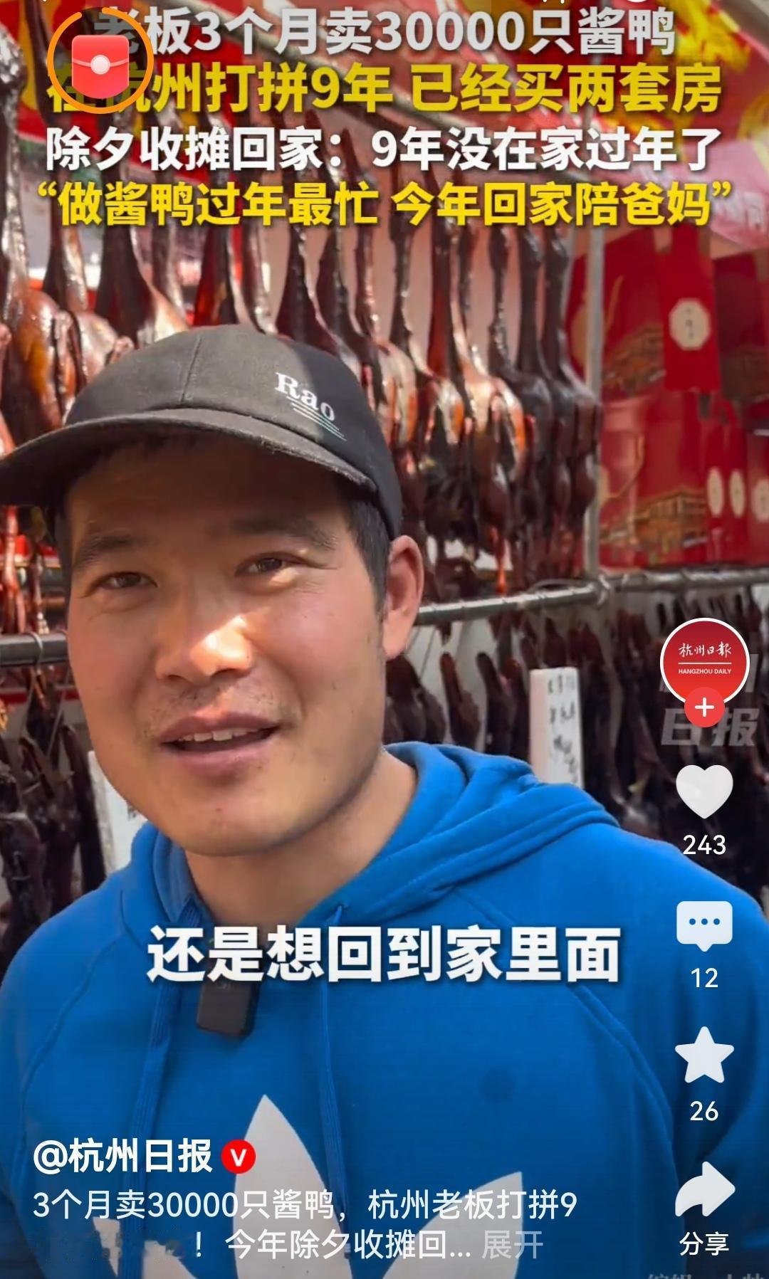 老板3个月卖3万只酱鸭9年没回家过年九年坚守,三万只酱鸭,是汗水也是勋章。每一份努力都不会被辜负,每一份坚持都有回响。终于可以收摊回家,把奋斗的滋味,变成团圆的年味。致敬每一个为生活打拼的普通人![心][心][心] 食材酱鸭 评论打卡任务