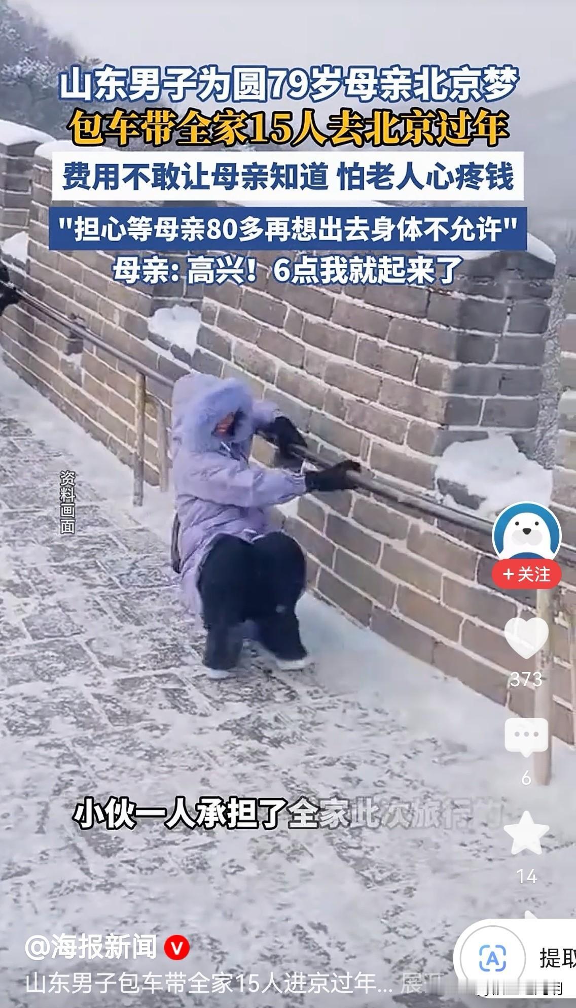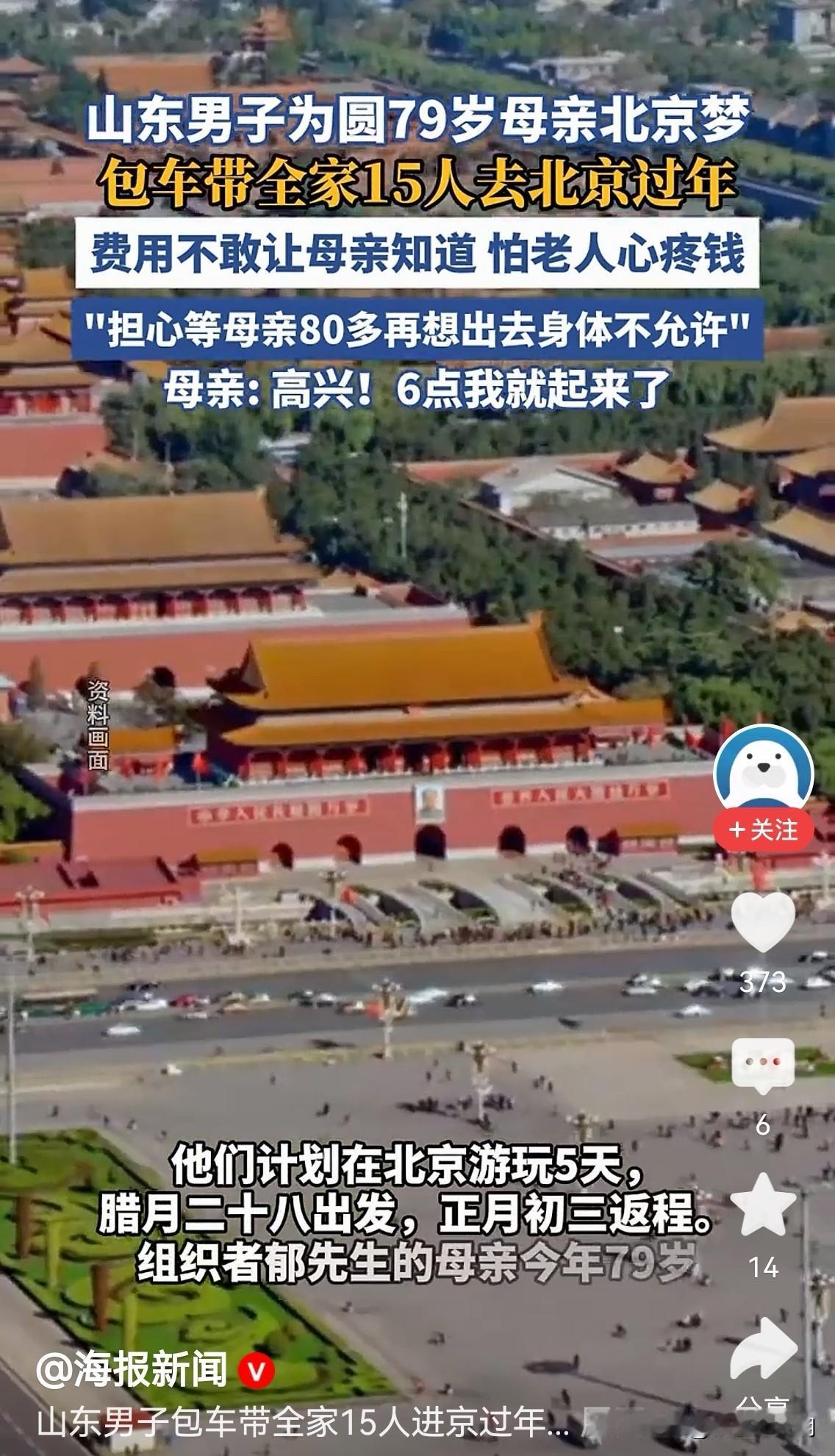 山东临沂小伙子郁某包车,带老母亲及亲朋15人进京过年,他们计划从农历腊月二十八玩到年初三,费用由其一个人承担。 包车,加上人数多,食住行、景点门票,费用不是个小数。小伙子没敢告诉自己的老母亲,怕老人知道了心疼钱。 但这笔钱花得是值得的:一是79岁的老母亲看到天安门,禁不住流下了眼泪。这一直也是老人的梦想,能亲眼看看天安门,并和天安门合影留念。 二是众多亲戚在一起相互陪伴,一起旅游,一起贺新年,该多么热闹。也因为费用有人承担,这么多人不用彼此去算计,减少了很多矛盾,行程很快乐! 不知道郁先生是做什么行业的,挣钱应该也很不容易。难得如此孝顺,大手笔带母亲圆满,虽然花了不少钱,也收获了满满的幸福!分享今日的感悟