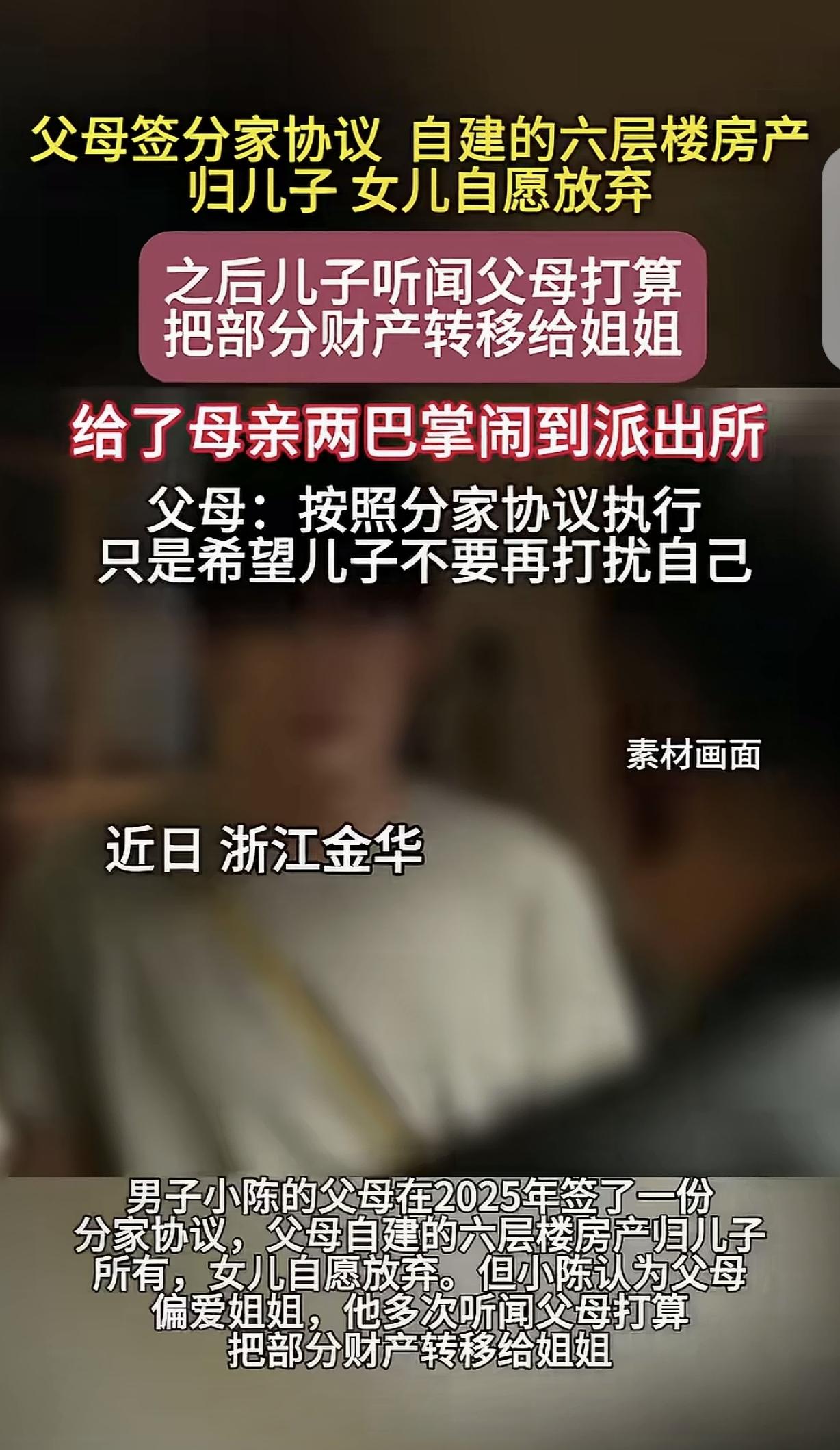 “养儿防老太讽刺了!”浙江金华,一男子跟父母签了分家协议,父母承诺把自建的6层楼房归他,姐姐自愿放弃。可男子却听闻父母打算把部分财产转移给姐姐,男子怒了,认为父母偏心,竟然狠狠的打了母亲2耳光,让人不可思议的是,母亲虽然很寒心,但还是要把6层楼房都给男子,只希望他不要再打扰父母。网友:真是糊涂父母,2个耳光太轻,没打醒! 在这个本该阖家团圆的月份,浙江金华一栋孤零零的六层高楼下,却响起了两记刺耳的耳光。被打的,是70多岁的老母亲。而施暴者,竟是她怀胎十月、视若珍宝的亲儿子。这远非简单的财产纠纷,而是一场亲情被贪婪吞噬的悲剧,甚至,是一场用“爱”铸就的囚笼。 浙江金华的街头有一栋自建的六层高楼,它孤零零地立在那儿,像一座钢筋水泥铸成的巨大墓碑。 在这个本该属于团圆的月份,这里没有传出过节的鞭炮声,只有两记清脆得让人心里发颤的耳光声。 被打的是一位70多岁的老母亲。她在自家这栋象征着财富的高楼下,捂着脸,眼神里不是愤怒,而是那种被野兽盯住般的惊恐。 而在她对面,那个满脸戾气、刚刚收回手掌的男人,正是她怀胎十月生下的亲儿子——小陈。 这根本不是一场关于“分配不均”的财产争夺战,而是一场关于“绝对垄断”的疯狂霸凌。 早在冲突爆发前的2025年,这个家庭就已经签署了一份堪称“溺爱极致”的《分家协议》。 白纸黑字,记录详实。此幢六层自建房,产权清晰,百分之百归属于儿子小陈,毫无含糊之处。 为了成全这份“独食”,姐姐甚至在现场签署了自愿放弃继承的声明,彻底退出了这场所谓的遗产游戏。 按理说,手握六层楼全部业权的小陈,已经是这场代际财富转移中唯一的赢家。 但贪婪这东西,从来没有阈值。它的可怕之处在于,它遵循的是零和博弈的死循环逻辑。 引爆这两记耳光的,仅仅是一个捕风捉影的“情报”:小陈听说,父母打算私下给姐姐一点经济补偿。 在正常人眼里,这是父母对女儿的一点愧疚补偿。然而,于小陈的逻辑而言,此笔款项被视作“赃款”。 既然六层楼都是我的,那父母兜里的每一分钱也理应是我的。给姐姐一块钱,就是从我口袋里偷走了一块钱。 这种不仅要吃肉,还要把骨髓吸干、把盘子舔净的心理,才是那两记耳光背后的真实动机。 他并非情绪失控使然,实则是借着过激行为展开一场暴力的“权力宣示”,以这种极端之态妄图彰显其所谓的权威与掌控力。他在测试父母的底线:在这个家里,不仅钱要归我,连支配权也得归我。 最让人脊背发凉的,是那一幕发生后的结局。 当民警介入,所有围观者都以为这会是剧情反转的时刻——父母心寒,收回房产,惩罚逆子。 然而现实却给了所有人一记闷棍:这对被殴打、被羞辱的父母,做出了一个违背常理的决定。 他们坚持维持原协议,六层楼房依然分文不少地全部归儿子,姐姐依然一无所有。 他们只在这个“不平等条约”后追加了一个卑微至极的条款:“永久不再打扰”。 这一刻,事情的性质彻底变了。这不再是一份财产赠予协议,而是一份赤裸裸的“买命契约”。 那栋六层楼,不再是父母给孩子的爱,而是受害者向施暴者缴纳的巨额“赎金”。 那两记耳光真的把父母打醒了。他们看清了面前站着的不是儿子,而是一个随时可能吞噬他们的黑洞。 他们恐惧了。他们深知,如果此时撤回房产,面临的可能就不只是耳光,而是更惨烈的肉体报复。 于是,他们选择了“割肉止损”。用这一辈子的积蓄,买断了与这个“白眼狼”的物理距离,祈求一个老死不相往来的安全晚年。 这就是原子化家庭最深的悲哀。有网友在评论区感慨:“这事要是发生在福建,宗族的长辈能把这逆子打个半死。” 但在金华的这个街头,没有宗族,没有家法,只有那一对孤立无援的老人,在法律和暴力的夹缝中瑟瑟发抖。 这场闹剧的终局早已注定。姐姐会因为彻底的心寒而转身离去,既然签了放弃书,那份亲情也就随之画上了句号。 而那栋六层高楼,终将成为困住小陈的荒岛。他虽在房产博弈中胜出,斩获屋宇,却于这一过程里,将人性中最后的一丝温煦与善意尽数输却,在物质的胜利里丢失了灵魂的温度。 至于那对父母,他们将在恐惧中度过余生,看着那栋亲手盖起的高楼,每一块砖瓦都写满了讽刺:养儿防老,最后防成了仇人。 消息来源:起点新闻——《听闻姐姐分家产儿子打了母亲两巴掌》