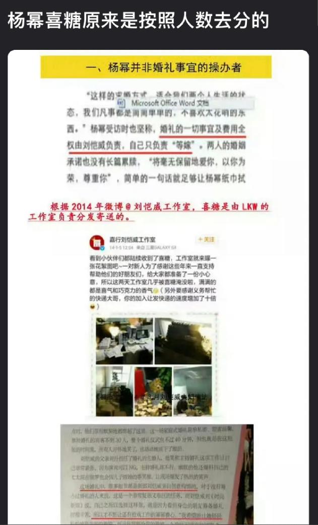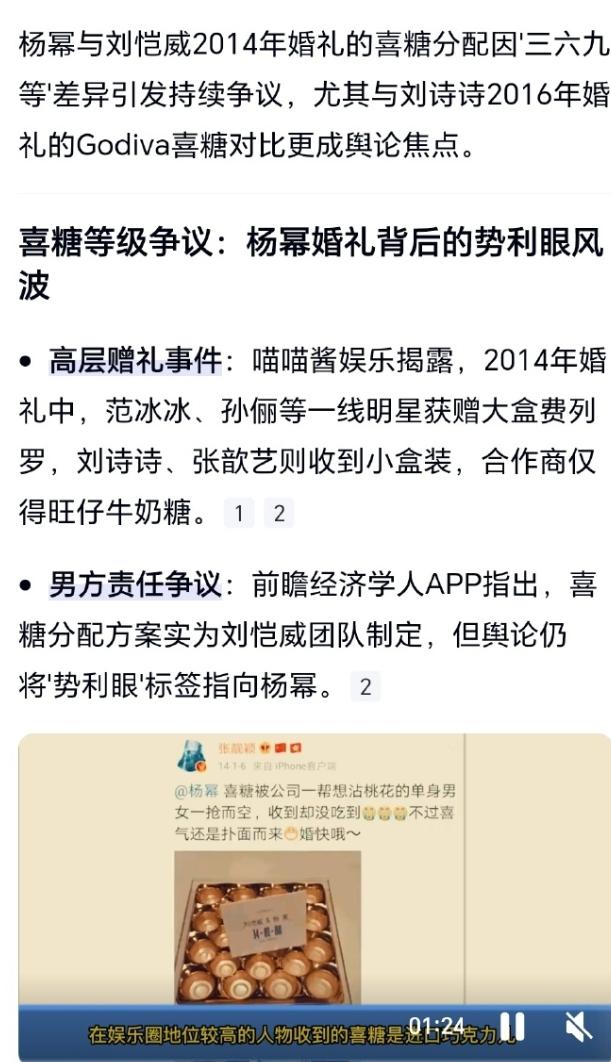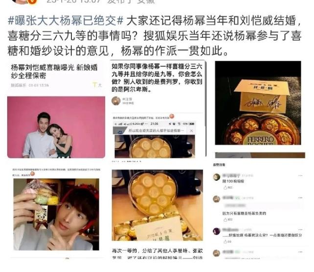杨幂结婚喜糖的瓜又被扒出来了! 杨幂最近因为C位事件,被扒出来的早期黑料也不少,只不过没被挂上热搜而已,当年她结婚的时候被爆给同事的喜糖分三六九等,一档是大盒费列罗,二档是小盒费列罗,三档是阿尔卑斯和旺仔,说她看人下菜碟,被扒出来后粉丝解释说喜糖是刘恺威方负责的,和杨幂没关系,不过有网友却扒出了当年的报道,说整个婚礼杨幂只参与了喜糖和婚纱环节,反正这件事也是每年都会被扒出来说一波。