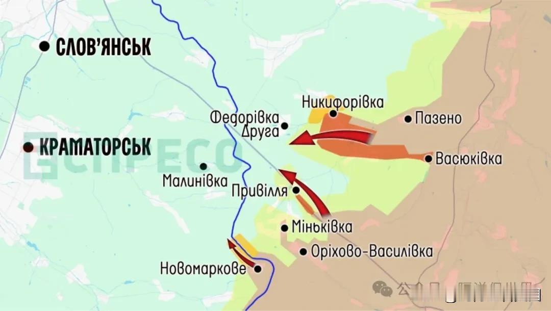 本周在斯洛维扬斯克战线上,俄罗斯加大了对克里瓦卢卡的攻势。村庄后方是北顿涅茨河海岸的显著高地。如果敌军成功占领它们,防守莱曼将变得非常困难,俄军也将在斯洛维扬斯克的进攻中获得显著优势。 目前,他们已在扎基特内村附近一段两公里的路段穿越了结冰的西韦尔斯基顿涅茨河。村里本身也发生了敌对行动。与此同时,这大大恶化了在扬皮尔的乌军防御者的处境。 村庄北部完全被俄军控制,俄军继续将防御军向南逼,逼至西韦尔斯基顿涅茨河岸边以及位于奥泽尔纳和迪布罗瓦森林中间的度假村庄。 作为斯洛维扬斯克进攻的第二条路线,俄军选择了从巴赫穆特通往斯洛维扬斯克的道路。 他们希望进入从南向北延伸、俯瞰克拉马托尔斯克和斯洛维扬斯克的主导高地。北顿涅茨克-顿巴斯运河穿过这座山丘的所有最高点。未来几个月,争夺他的战斗将成为焦点。 俄军已在山丘上及运河两岸靠近新马尔科沃村,但长期未能在此进一步推进。因此,他们制造了多个攻击区域,准备从中攻入该山。 一条路线经过明科夫卡和普里维尔内村庄,另一条则从瓦苏基夫卡通往费多里夫卡·德鲁哈。 正是在那里,2月,敌军大幅扩大控制区,占领了数个村庄,开始争夺尼基福里夫卡,并抵达费多里夫卡德鲁哈郊区。 与此同时,他们进入了普里维利亚我们守军的侧翼,这可能导致乌军在这些村庄的防御被削弱,并被迫撤退到沿运河的新防线。