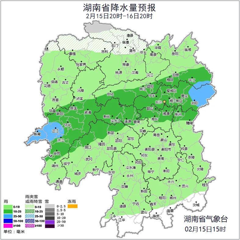 湖南发布寒潮黄色预警 气温骤降10-12℃ 除夕初一遇雨雪霾三重考验 2026年2月15日,湖南迎来暖热峰值,午后省内大部地区气温升至25℃,常宁以29.6℃成为当日全省气温最高值。这份暖热仅为昙花一现,湖南省气象台于当日16时继续发布寒潮黄色预警,强冷空气自今夜起全面南下,全省将迎来强降温、大风、降雨同步上线的“速冻”模式,腊月二十八至正月初一还将遭遇雨雪、大风、霾三重天气考验,对春运返程及春节首日出行带来显著影响。 本次寒潮黄色预警覆盖时段为2月15日20时至17日20时,预警区域包含长沙、株洲、湘潭、湘西州中南部、岳阳东南部、怀化、娄底、邵阳、衡阳、永州中北部、郴州北部等区域。预警显示,上述区域平均气温将骤降10~12℃,最低气温跌破4℃,同时伴随6~8级大风,部分区域阵风可达7~9级,冷暖快速切换下天气体感差异显著。 湖南省气象台发布了分时段精准天气预报,腊月二十八至正月初二的天气走势清晰明确: 15日晚上至16日白天(腊月二十八),湘中以北地区阴天有小到中等阵雨或雷阵雨,长沙东部、怀化西部局地迎来大雨,湘西北高海拔地区出现雨夹雪或雪,局地伴有冻雨;其余大部地区由多云转阵雨或雷阵雨,全省北风4~5级,阵风7~9级;气温方面,湘北最低2~4℃,其余地区4~8℃,最高温湘南18~20℃,湘北仅6~8℃。 16日晚上至17日白天(除夕至正月初一),湘北地区由小雨或雨夹雪转阴天,其余地区阴天并伴有小雨,湘西南局地中雨;北风由3~4级逐渐减小至2~3级;气温继续走低,湘西北最低温0~2℃,湘南4~6℃,其余地区2~4℃,全省最高温普遍在6~11℃。此阶段省内大部地区还将出现中至重度霾,外源污染物传输叠加本地污染累积,空气能见度大幅降低。 17日晚上至18日白天(正月初一至初二),全省转为多云间晴天,仅湘西南局地有阵雨;北风维持2~3级,气温仍处于低位运行,湘西北最低温0~2℃,全省最高温回升至9~15℃,天气转好后利于市民游客走亲访友。 从湖南主要城市未来7天天气趋势来看,全省整体呈现“先骤降后缓升”的特点,长沙、株洲、湘潭等核心城市15日晚起均迎降雨大风天气,除夕气温普遍跌至4~7℃,初一气温触底后,初二起随晴天到来逐步回升;正月初五至初七,湘中以南地区还将迎来新一轮阵性降雨过程,春节后期出行仍需做好防雨准备。 针对此次寒潮及春节期间的复杂天气,气象部门发布多维度温馨提示,保障市民春节出行与生活安全: 一是做好交通出行安全防范,重点关注15日晚至16日湘中局地强降雨引发的地质灾害风险,江湖水面、高海拔山区需严防大风对水上交通、户外活动的影响,除夕至初一的霾天及低能见度天气,将对高速、城区交通造成影响,驾车需减速慢行。 二是加强防寒保暖与健康防护,此次气温断崖式下降易诱发呼吸道及心脑血管疾病,老人、儿童等重点人群减少外出,公众根据气温变化及时增添衣物,同时关注能源保供情况。 三是做好霾天应对,16日至17日减少户外活动,外出佩戴口罩等防护用品,室内做好通风换气。 四是注意取暖与用火安全,低温天气下取暖用火用电用气需求增加,需谨防火灾、煤气中毒等事故;此外,正月初二起全省多地转为连晴天气,春节祭祀用火增多,需加强火源管控。