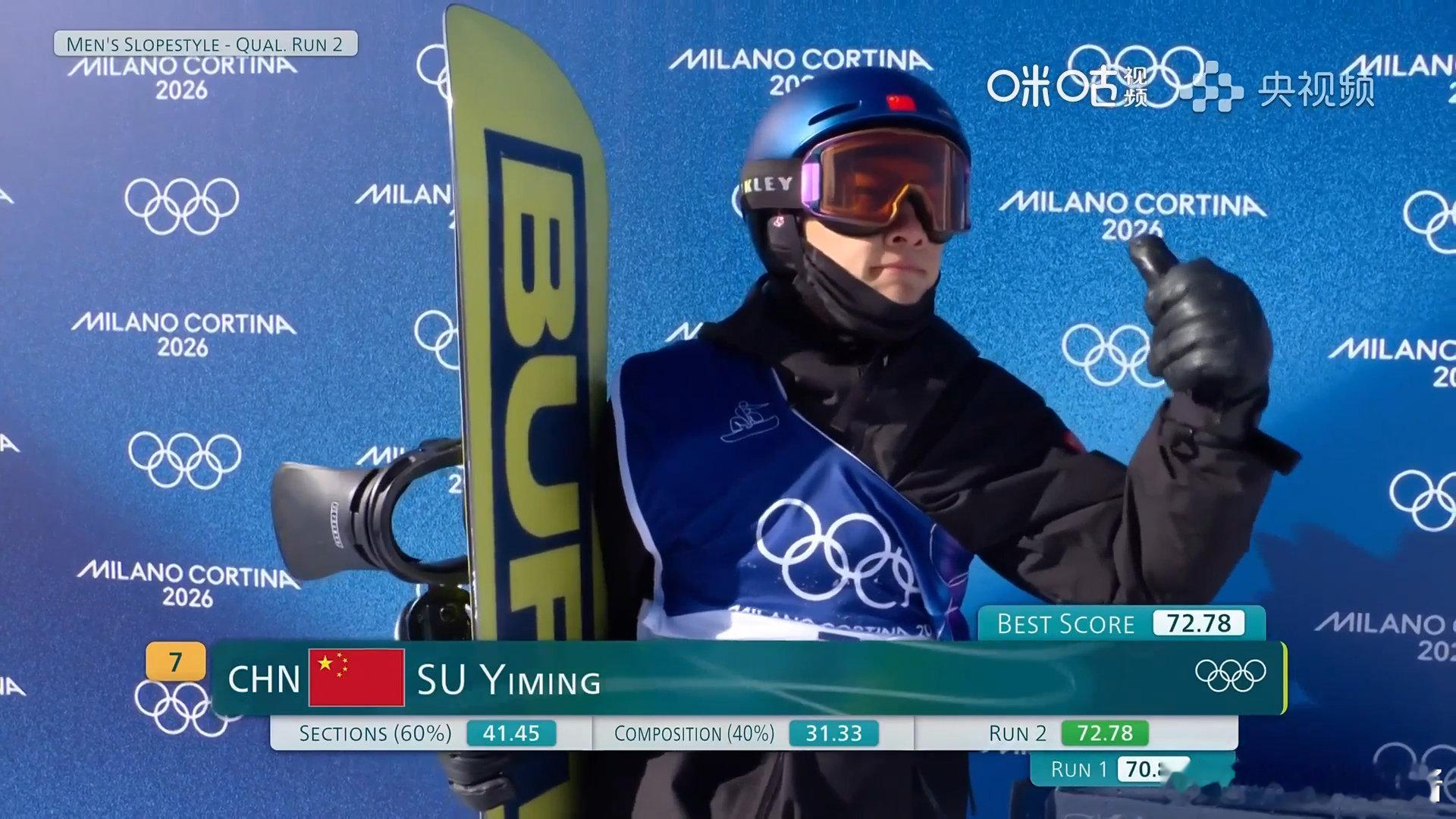 苏翊鸣第二滑稳健完赛苏翊鸣第二滑72.78分