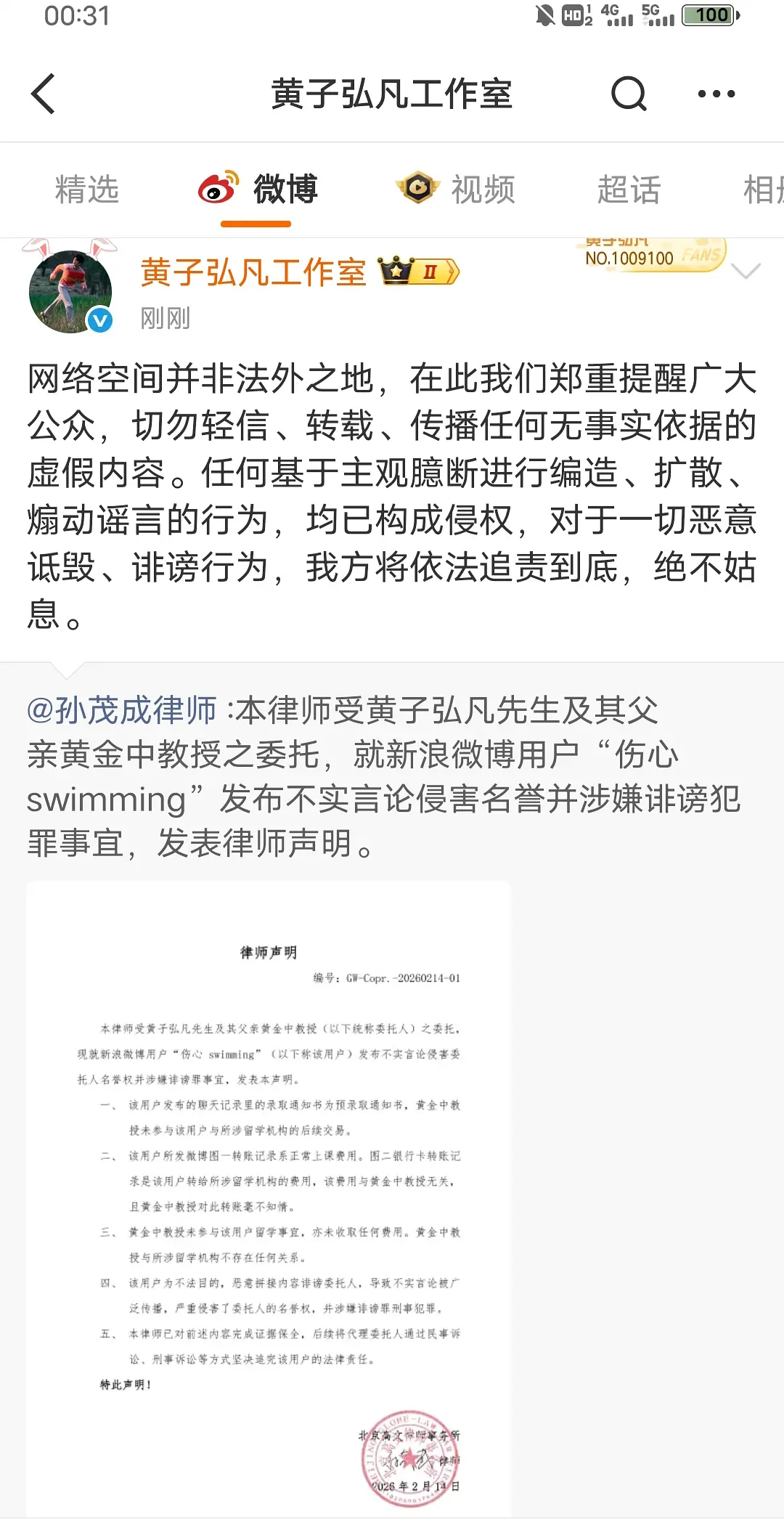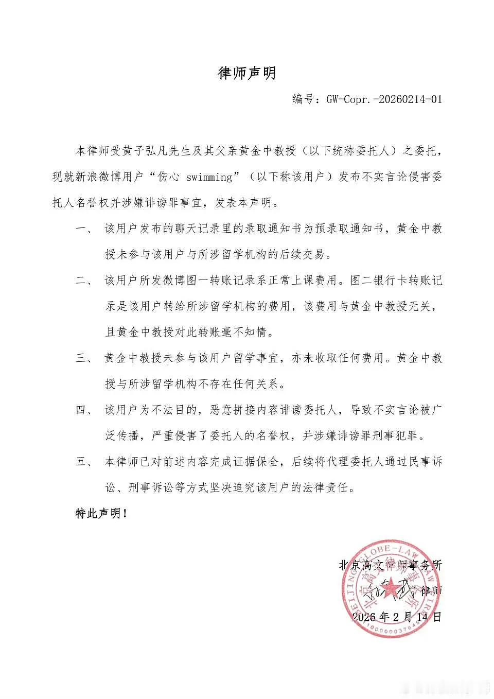 黄子弘凡工作室律师声明来了,该网友转给黄子弘凡父亲的钱是正常上课费,至于其他费用