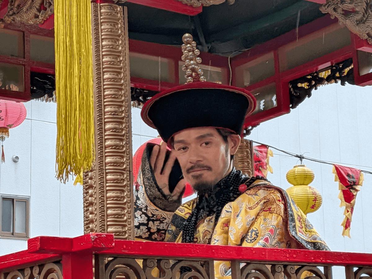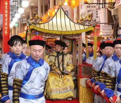 日本前国脚在长崎唐人街穿清朝龙袍庆祝春节。 为什么不扮演日本天皇?因为日本已经不过春节了,日本把春节完全算成中国新年,“皇帝巡游”选在日本的唐人街。 前日本国脚山口萤扮演皇帝,长崎出生的艺人永田爱实扮演皇后。 巡游队伍中还有太监。