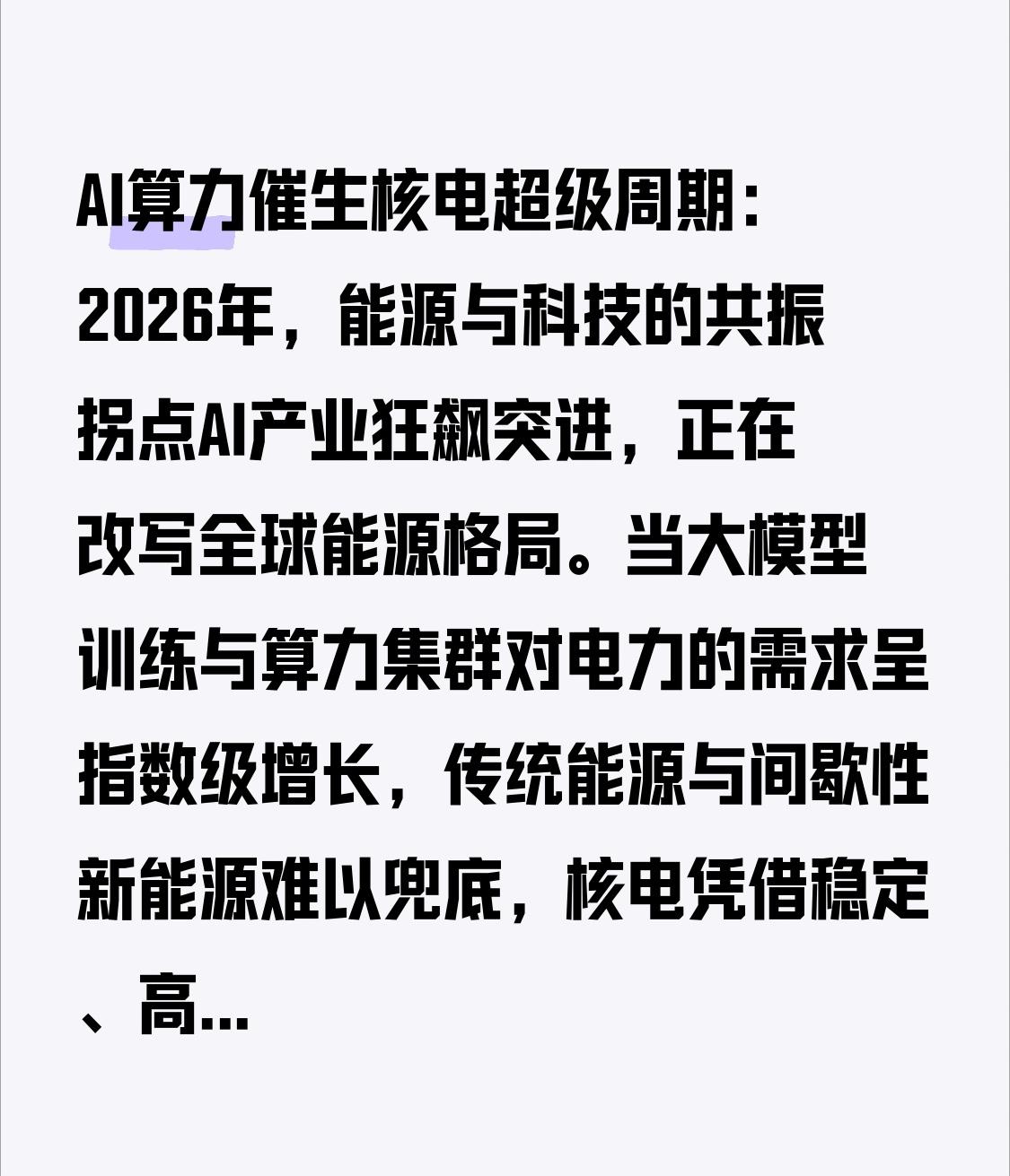 AI算力催生核电超级周期:2026年,能源与科技的共振拐点 AI产业狂飙突进,正在改写全球能源格局。 当大模型训练与算力集群对电力的需求呈指数级增长,传统能源与间歇性新能源难以兜底,核电凭借稳定、高效、零碳的独特优势,正式从补充能源升级为支撑AI发展的核心基荷电源,一场由算力驱动的核电超级周期已然开启。 过去几年,市场对AI的讨论聚焦于算法、芯片与模型,却忽略了最底层的支撑——电力。 数据显示,全球数据中心用电量正以每年17%的速度增长,2030年耗电量将突破2200太瓦时,相当于印度全国一年的用电总量。 国内AI数据中心2025年耗电量达320亿度,同比增长45%,大型智算中心单日耗电量堪比一座中小城市。 AI算力对供电的要求极为苛刻,不仅需要超大功率,更要7×24小时不间断稳定运行,任何电压波动或断电都可能导致训练中断、数据丢失,造成巨额损失。 风电、光伏受天气与昼夜影响,出力不稳定,储能技术在成本、容量与响应速度上仍有瓶颈,火电面临严格的碳排放约束,在多重限制下,核电成为满足AI算力刚性用电需求的唯一可行解。 核电机组年利用小时数超8000小时,容量因子超过90%,远高于风光等新能源,能够持续稳定输出电力,且全生命周期零碳排放,完美匹配数据中心的绿电合规要求与供电稳定性需求。 全球科技巨头早已洞察这一趋势,微软、Meta、亚马逊纷纷签订长期核电购电协议,直接锁定核电产能,AI产业的竞争正从算力比拼转向能源主权的争夺。 国内核电产业已进入常态化核准、规模化建设、集中化交付的三重高峰,为超级周期提供坚实支撑。 “十四五”以来,我国核电核准节奏持续加快,累计核准机组超50台,2026年一季度计划集中核准6台机组,连续多年保持年核准机组不少于10台的节奏。 截至2026年初,中核、中广核等龙头企业在建及核准待建机组超30台,装机容量超4000万千瓦,在建规模稳居全球第一。 今年1月,江苏徐圩全球首个双堆耦合核能项目开工,华龙一号批量建设推进,设备国产化率超90%,标志着我国核电技术与产业链成熟度达到世界顶尖水平。 核电超级周期的红利,正沿着产业链有序传导,2026年是业绩兑现的关键分水岭。 上游核级设备与材料率先受益,核岛主设备、核级锻件、蒸汽发生器、主管道等核心部件进入交付高峰期,订单饱满且利润率可观。 中游工程建设与设备制造企业,凭借批量建设与技术迭代,营收与利润同步释放。 下游运营企业受益于电量增长与电价稳定,迎来业绩与估值双击。 远期来看,小型模块化反应堆、先进四代堆、核能-算力综合体、乏燃料后处理、核聚变等技术方向,不断打开行业成长天花板,让核电超级周期具备长期持续性。 这场由AI算力驱动的核电复兴,不是短期题材炒作,而是能源结构转型与数字经济发展共振下的长期产业趋势。 双碳目标下,核电作为基荷零碳电源的战略地位持续提升;AI产业爆发,为核电提供确定性的增量需求;政策常态化核准与技术突破,扫清行业发展障碍。 三重逻辑叠加,推动核电行业从沉寂多年的周期赛道,转向高景气成长赛道,未来10至20年都将保持高速发展。 任何产业周期都伴随风险,核电行业也不例外。核电建设周期长达7至10年,与AI需求短期爆发存在时间错配,短期内需依赖多能互补过渡;核级设备产能存在短期瓶颈,可能制约建设速度;政策审批、安全运营等因素也会影响行业节奏。但长期来看,这些问题都将随着产业成熟逐步解决,不改超级周期的大方向。 站在2026年的时间节点,AI算力与核电的融合正从概念走向现实,能源与科技的双向奔赴,正在催生万亿级市场。 对于投资者而言,核电产业链是兼具确定性与弹性的优质赛道;对于产业而言,这是中国能源技术领跑全球的重要机遇。 当AI的尽头是算力,算力的尽头是电力,核电的黄金时代,才刚刚拉开帷幕。 AI能源需求 AI算力时代 AI电力瓶颈